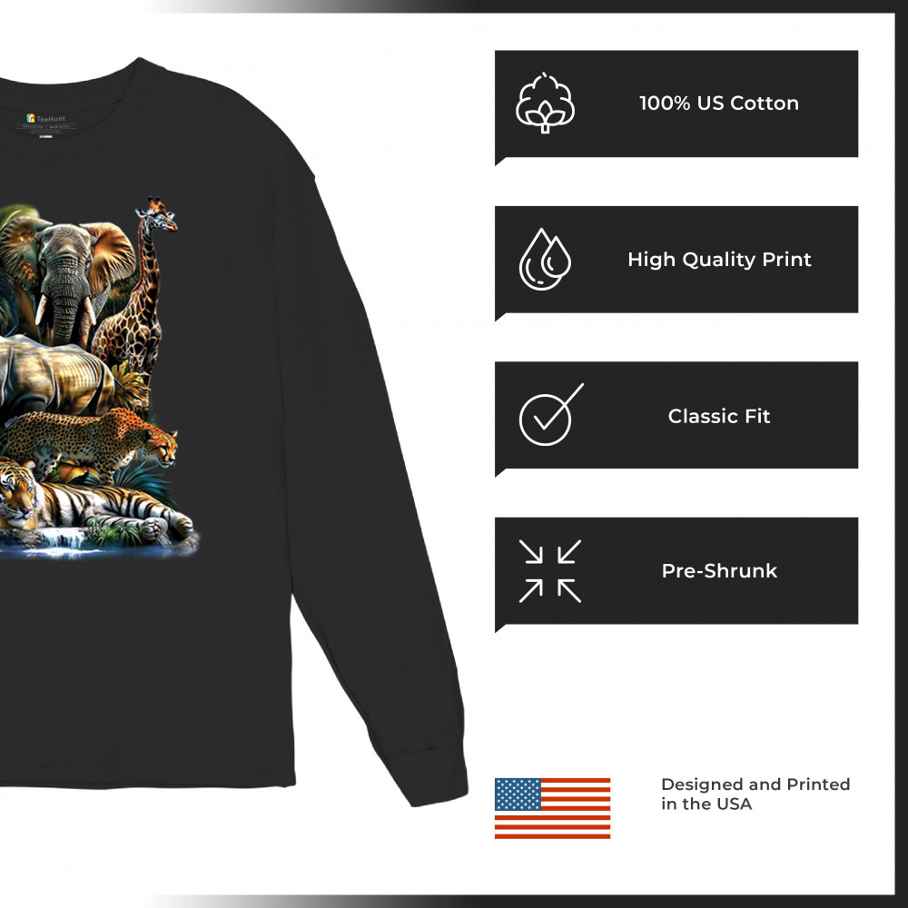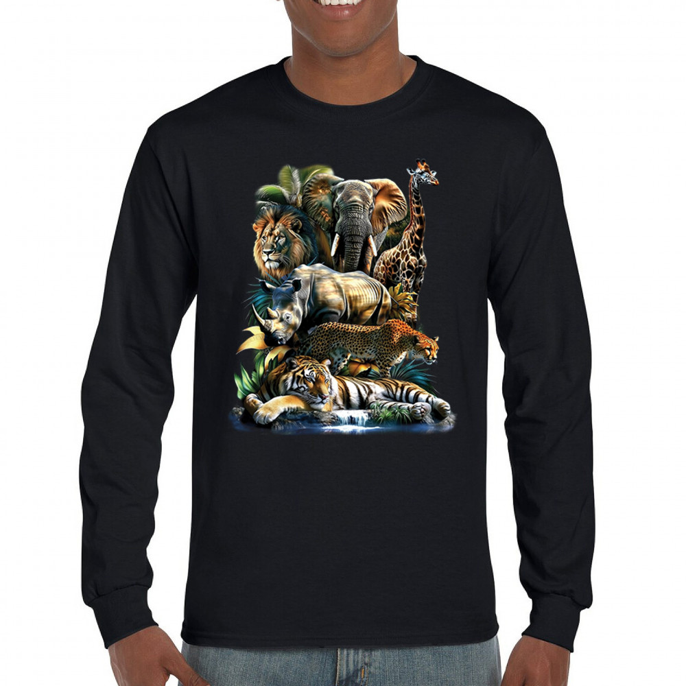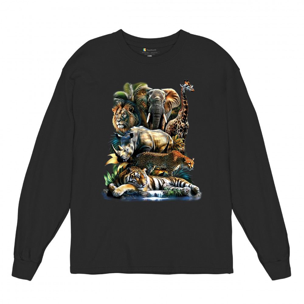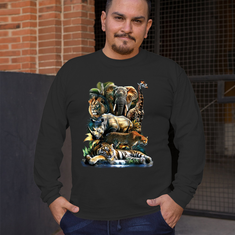 Wildlife design with lion, tiger, giraffe, rhino, cheetah, and elephant. Perfect for animal lovers and safari fans who embrace nature’s fierce spirit.