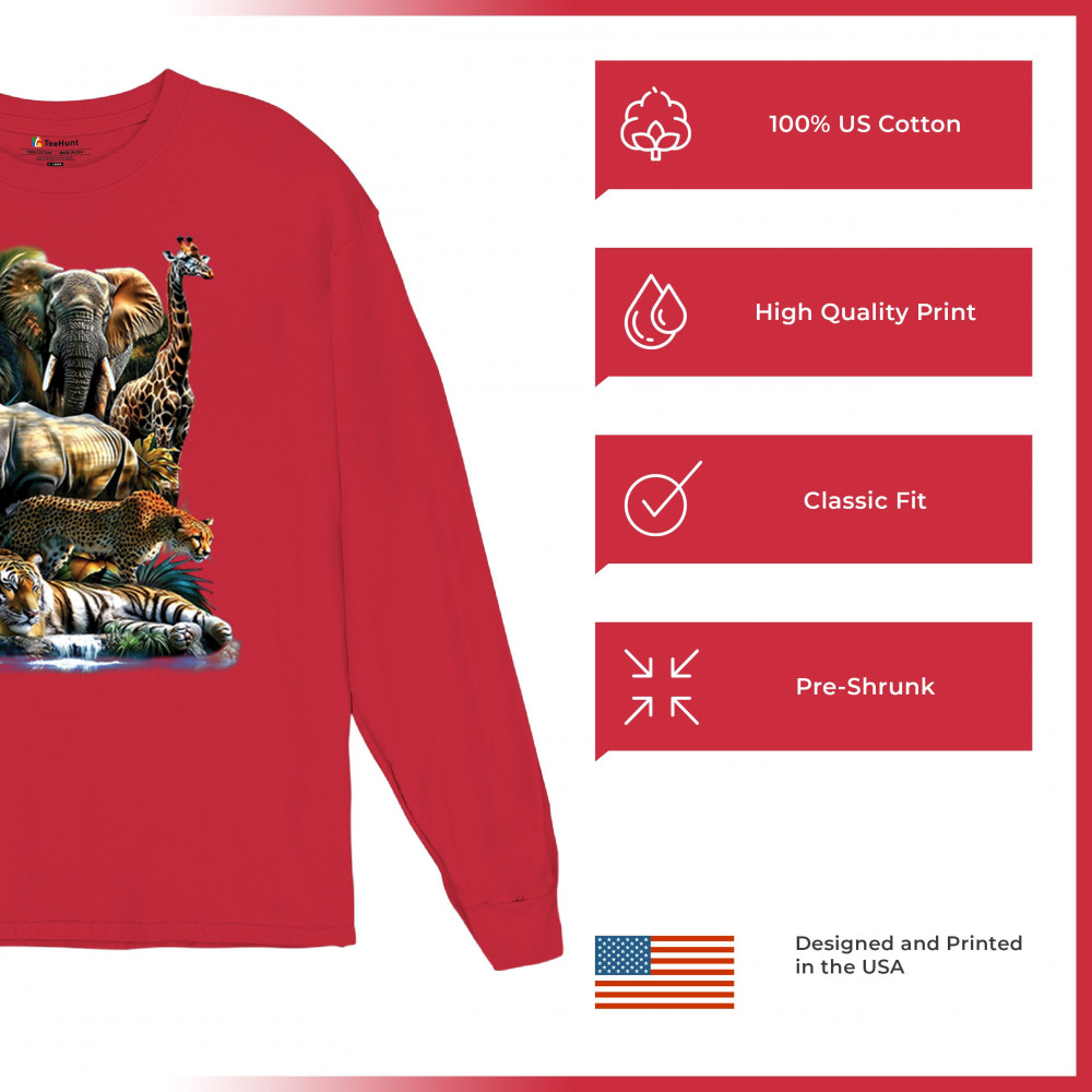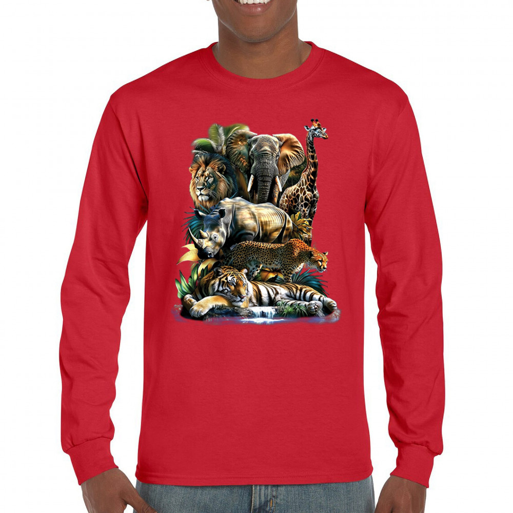 Wildlife design with lion, tiger, giraffe, rhino, cheetah, and elephant. Perfect for animal lovers and safari fans who embrace nature’s fierce spirit.
