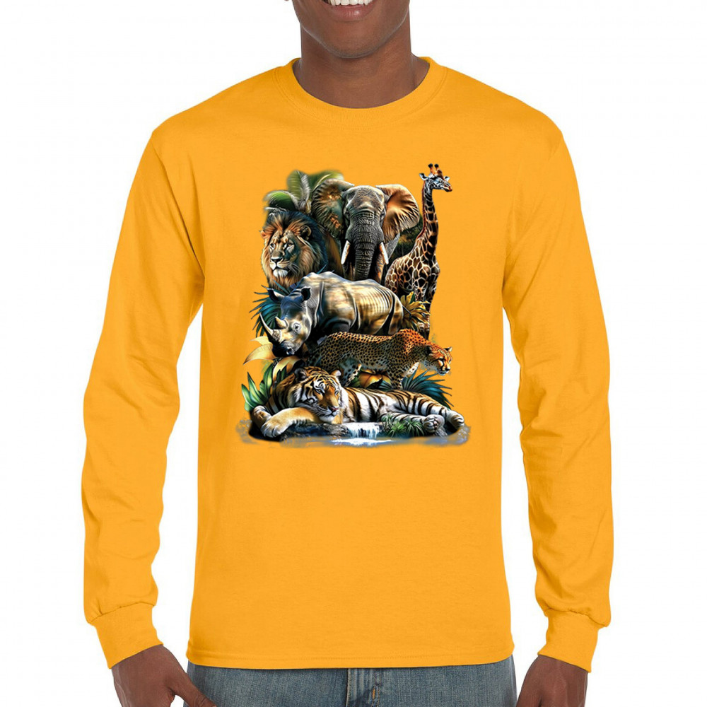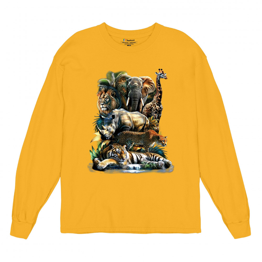 Wildlife design with lion, tiger, giraffe, rhino, cheetah, and elephant. Perfect for animal lovers and safari fans who embrace nature’s fierce spirit.