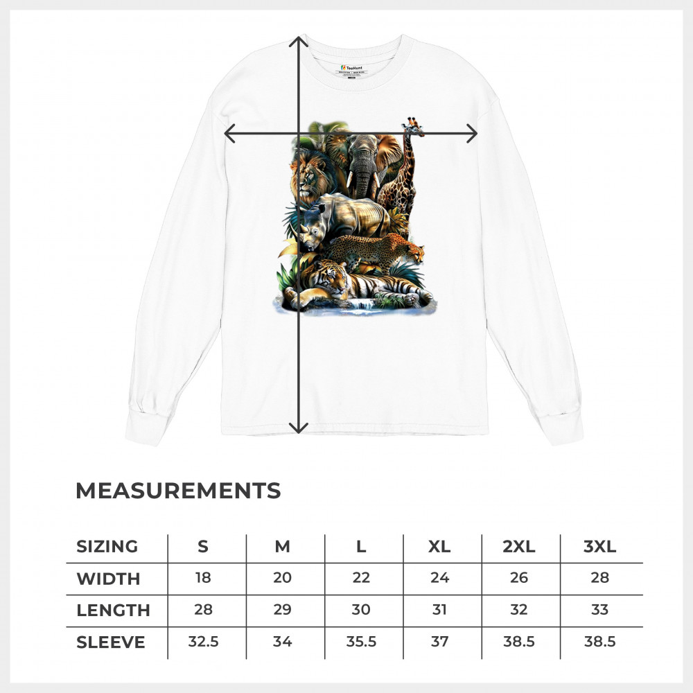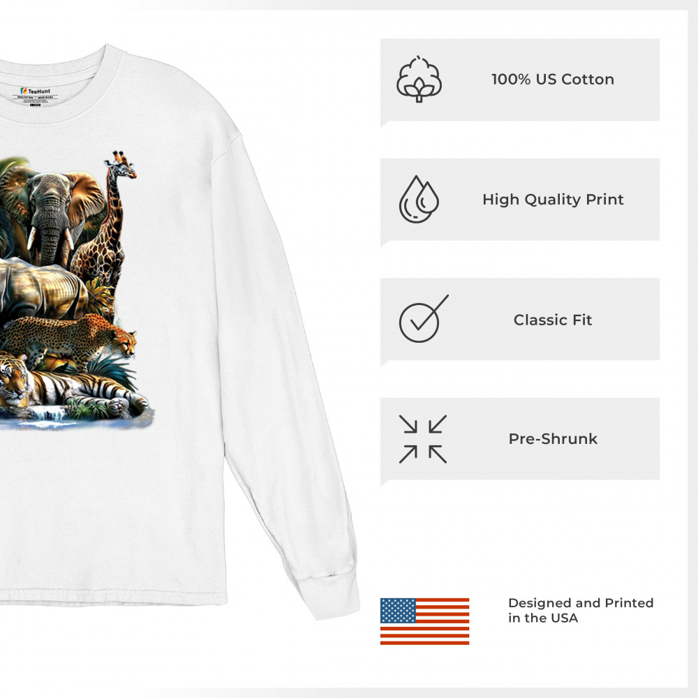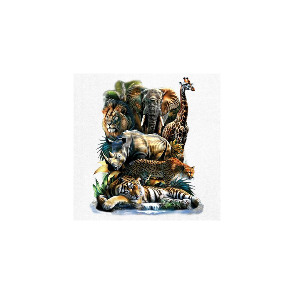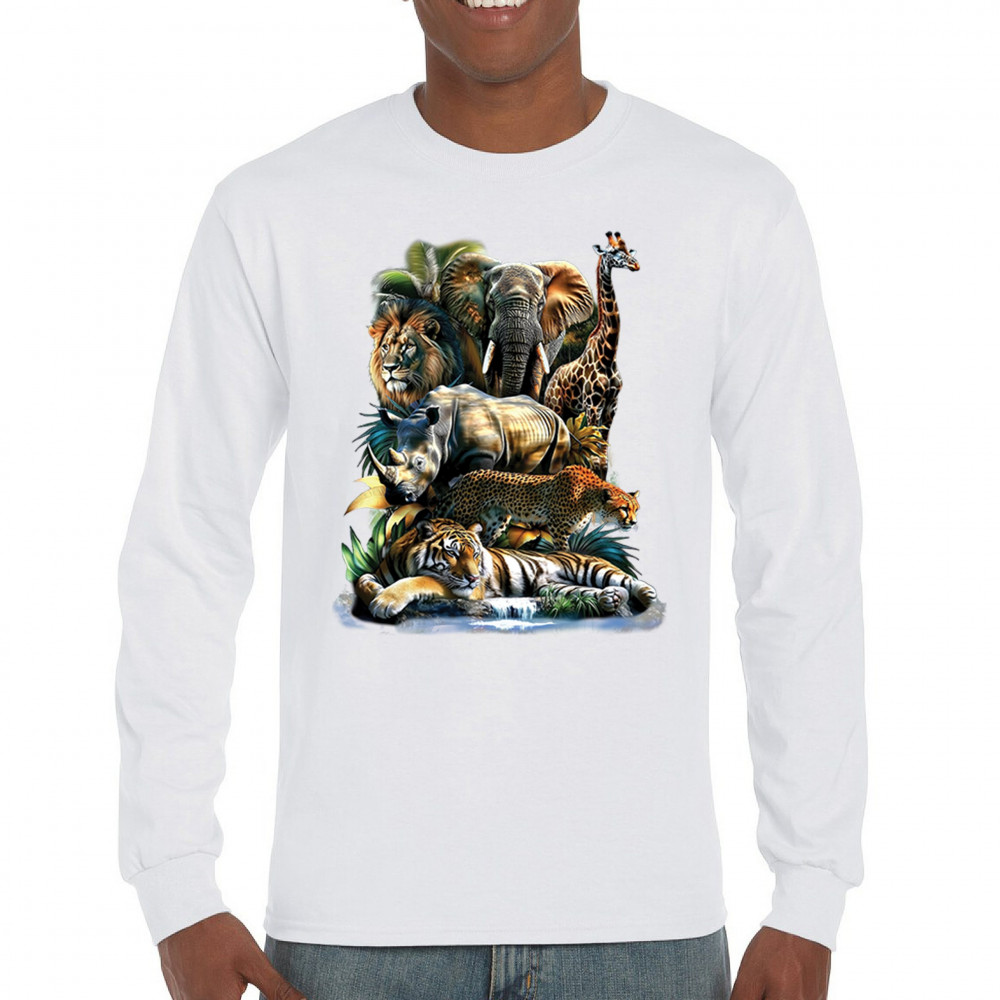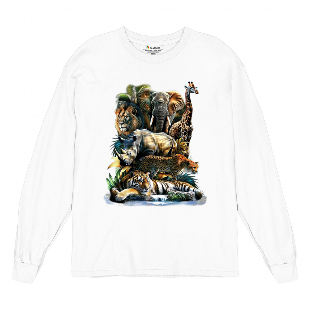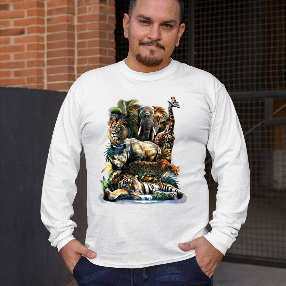 Wildlife design with lion, tiger, giraffe, rhino, cheetah, and elephant. Perfect for animal lovers and safari fans who embrace nature’s fierce spirit.