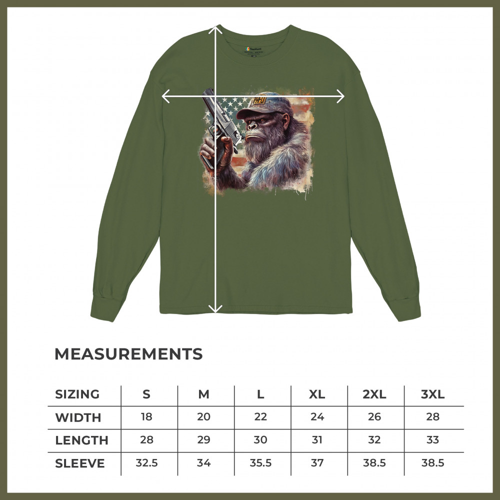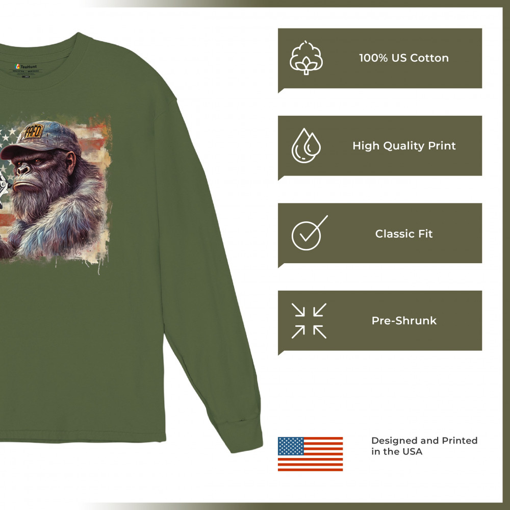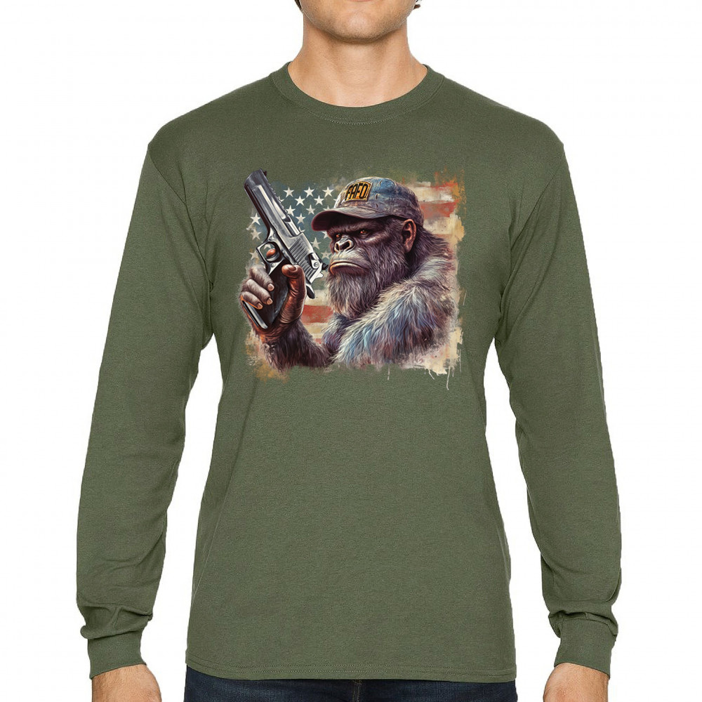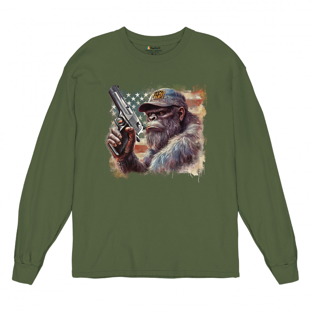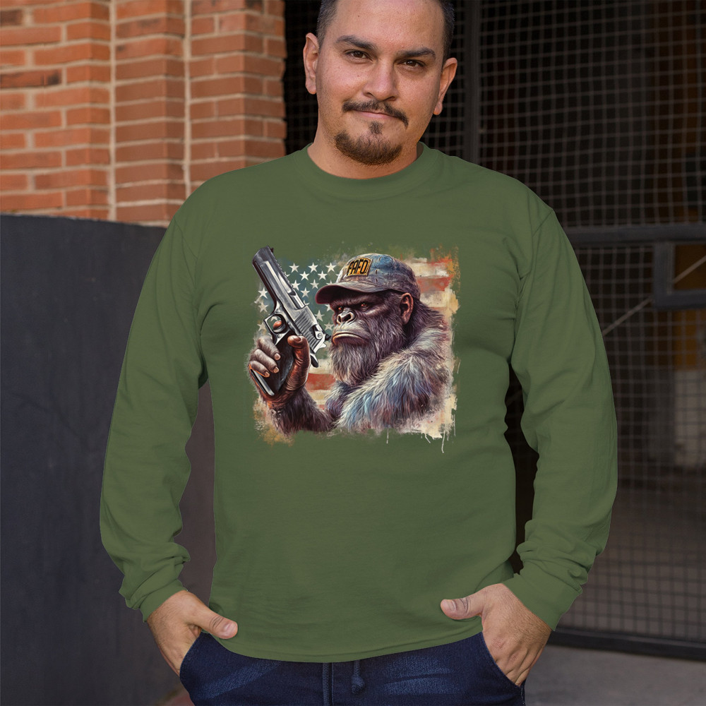Show your Second Amendment pride with this bold patriotic gorilla design featuring the American flag and a firearm. Perfect for gun rights supporters, veterans, and freedom lovers.