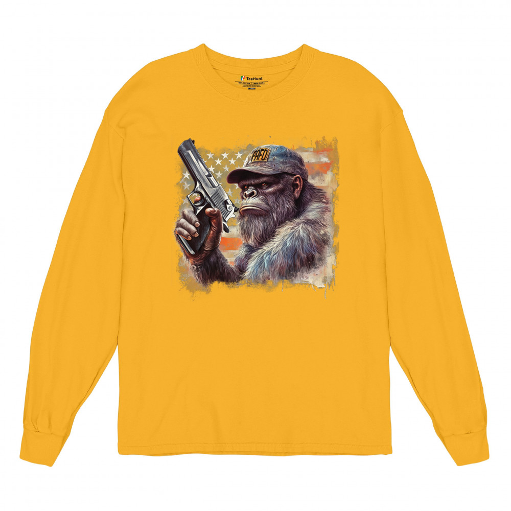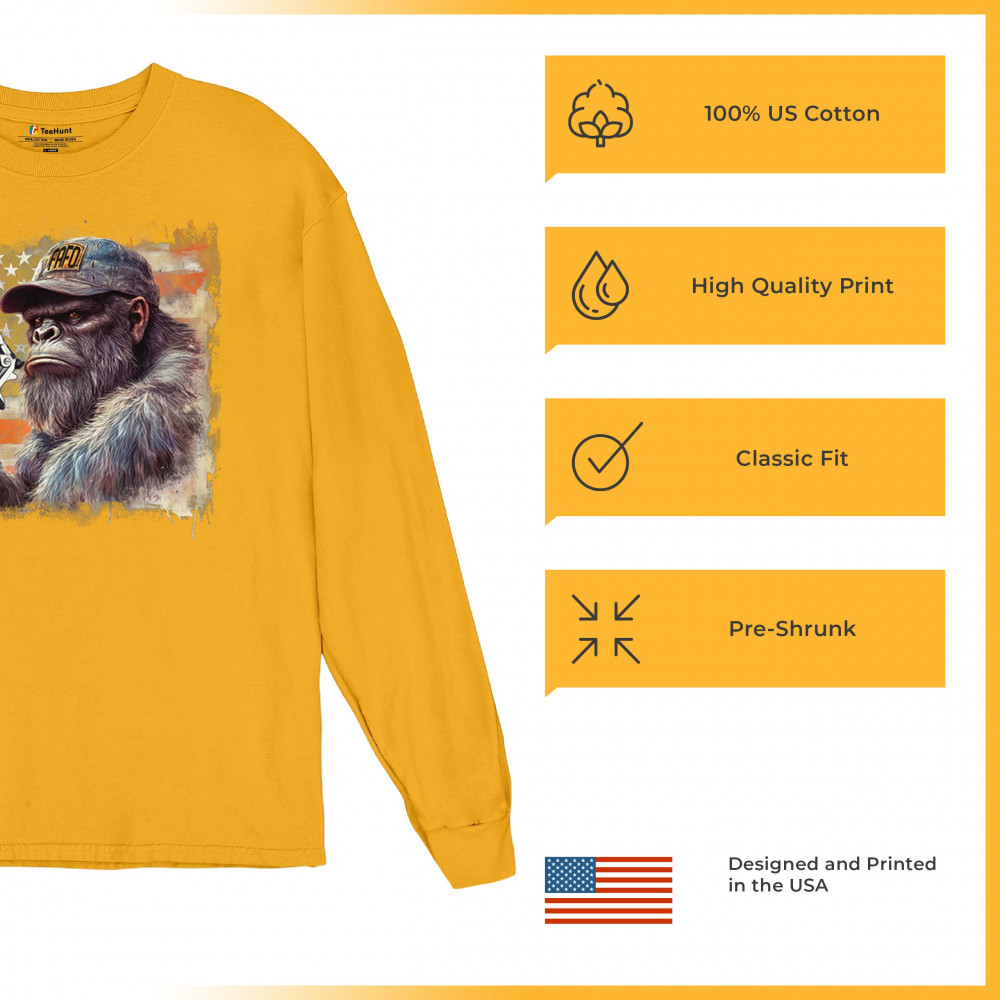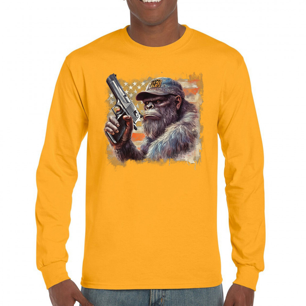 Show your Second Amendment pride with this bold patriotic gorilla design featuring the American flag and a firearm. Perfect for gun rights supporters, veterans, and freedom lovers.