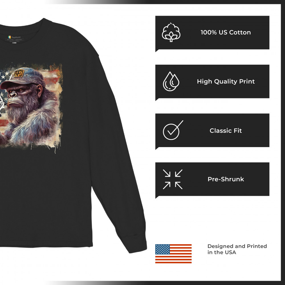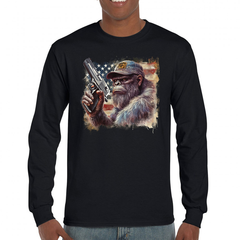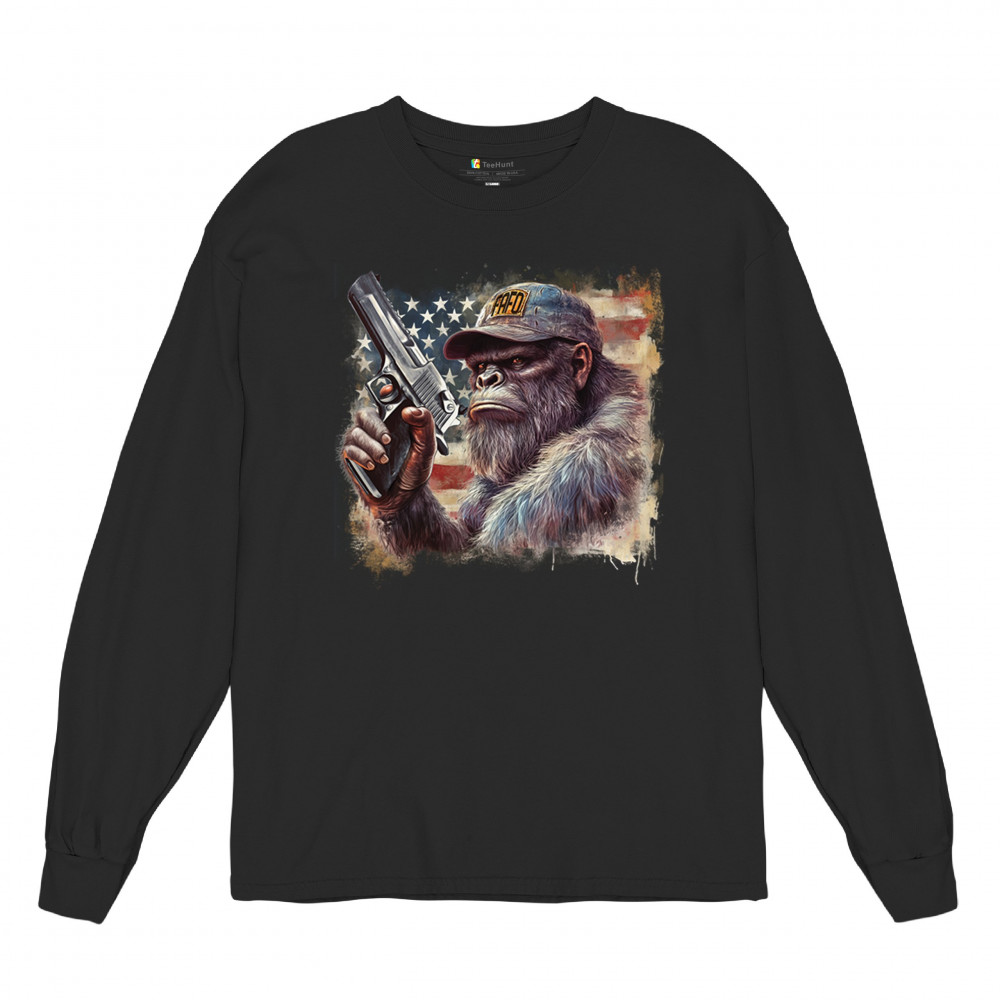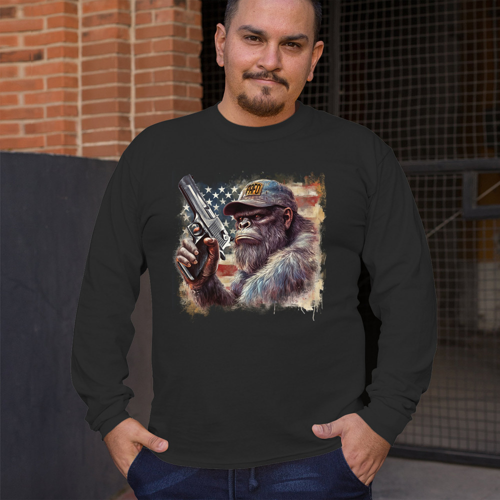 Show your Second Amendment pride with this bold patriotic gorilla design featuring the American flag and a firearm. Perfect for gun rights supporters, veterans, and freedom lovers.