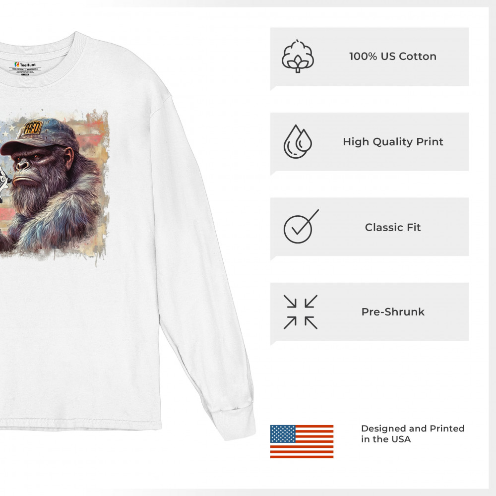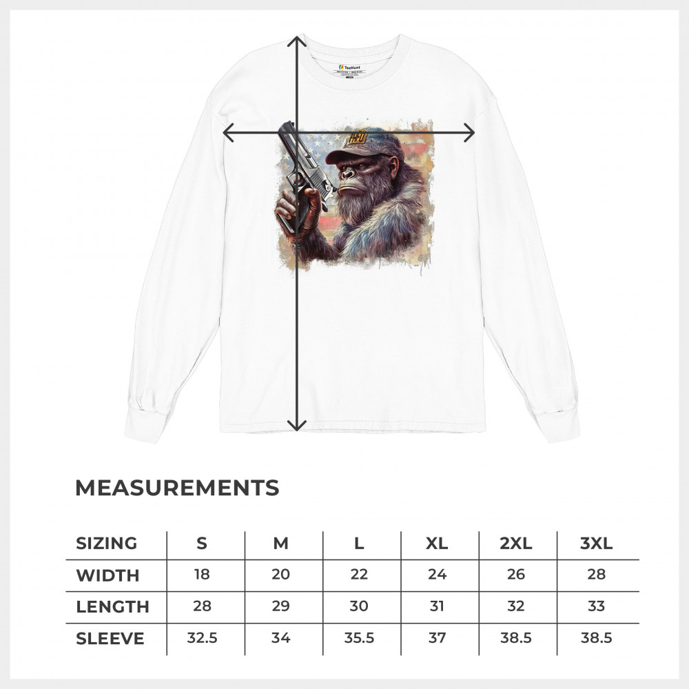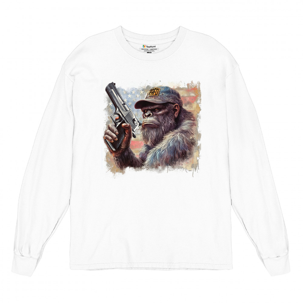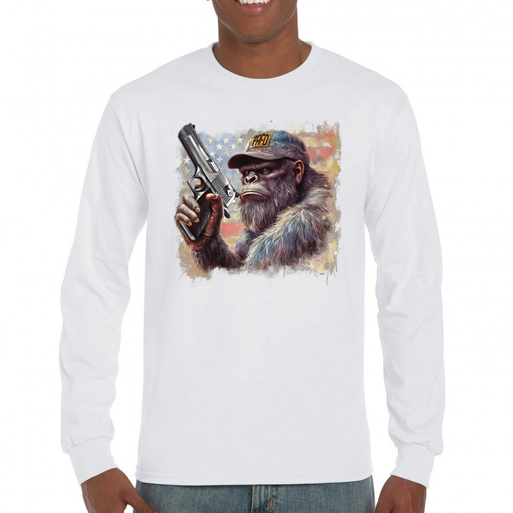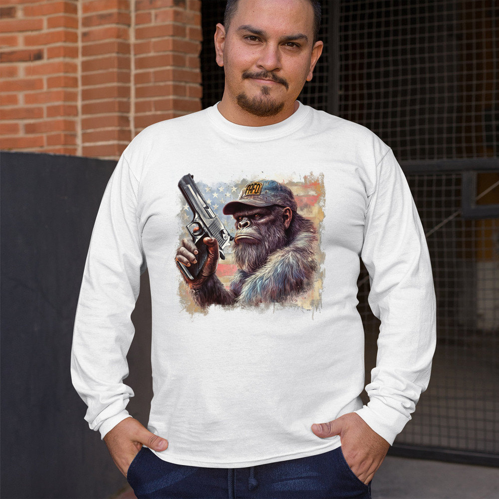 Show your Second Amendment pride with this bold patriotic gorilla design featuring the American flag and a firearm. Perfect for gun rights supporters, veterans, and freedom lovers.