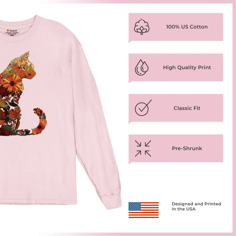 Bring autumn charm to your wardrobe with this cozy cat design filled with fall leaves and florals. Perfect for pet lovers, rustic farmhouse style, pumpkin patch outings, and fall festivals, it’s a unique way to showcase both your love of cats and seasonal harvest vibes.