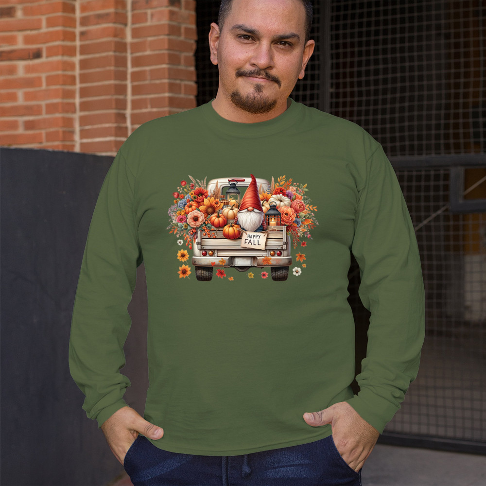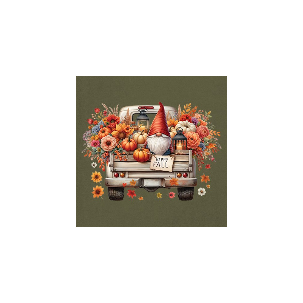 Rustic gnome truck design with pumpkins, wildflowers, and lantern glow. Perfect for Thanksgiving Day, farmhouse harvest, and cozy autumn style.