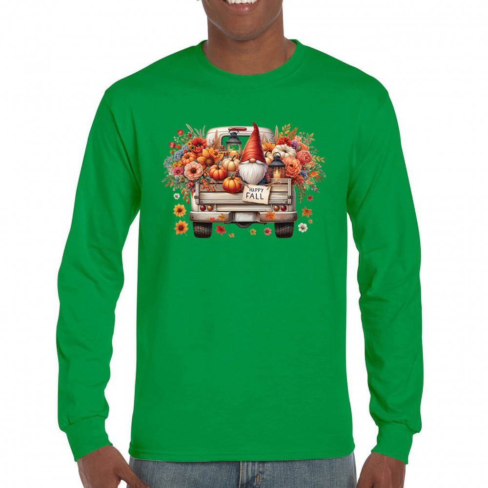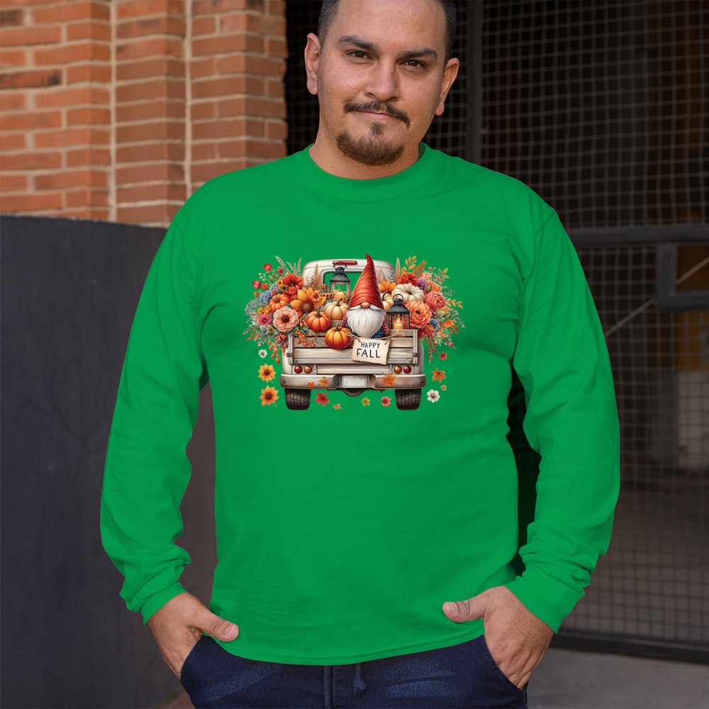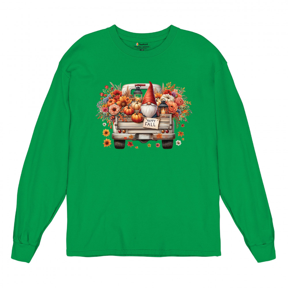 Rustic gnome truck design with pumpkins, wildflowers, and lantern glow. Perfect for Thanksgiving Day, farmhouse harvest, and cozy autumn style.