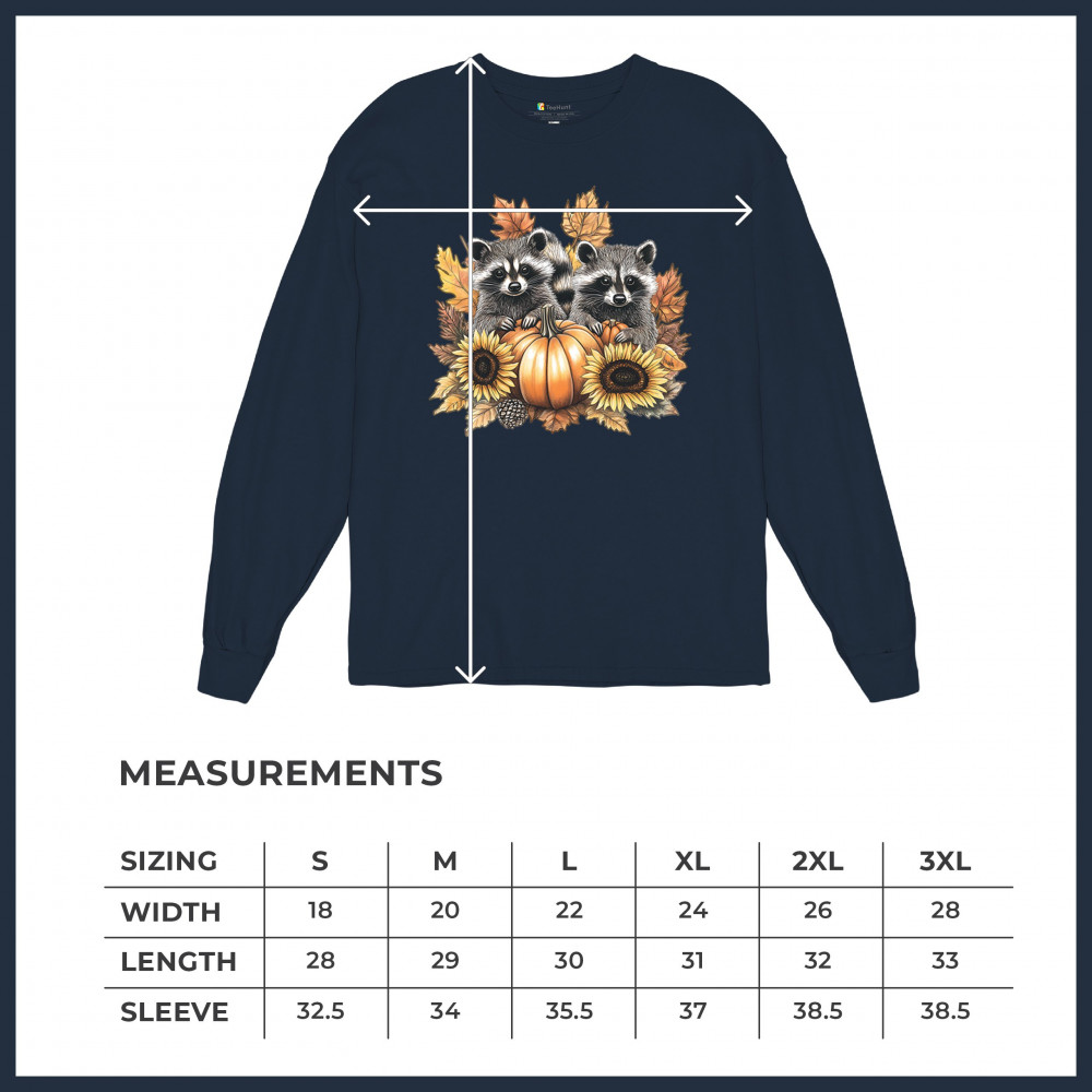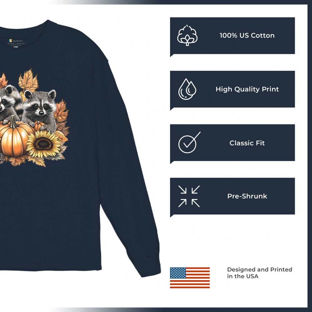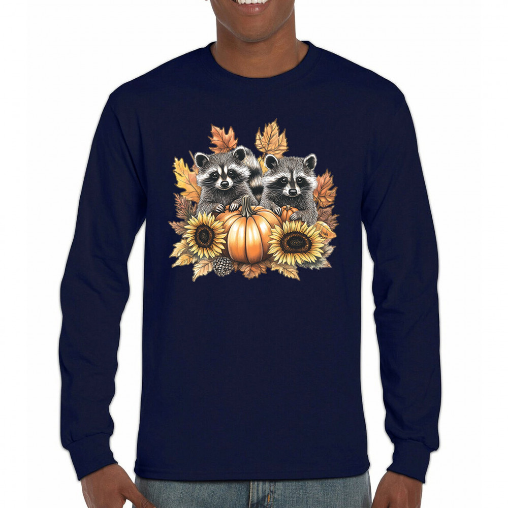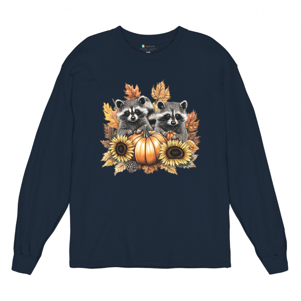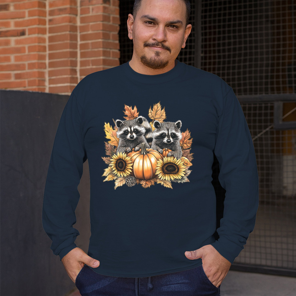 Rustic autumn raccoon design with pumpkins and sunflowers. Perfect for Thanksgiving, pumpkin patch days, farmhouse harvest, and woodland fall fashion.