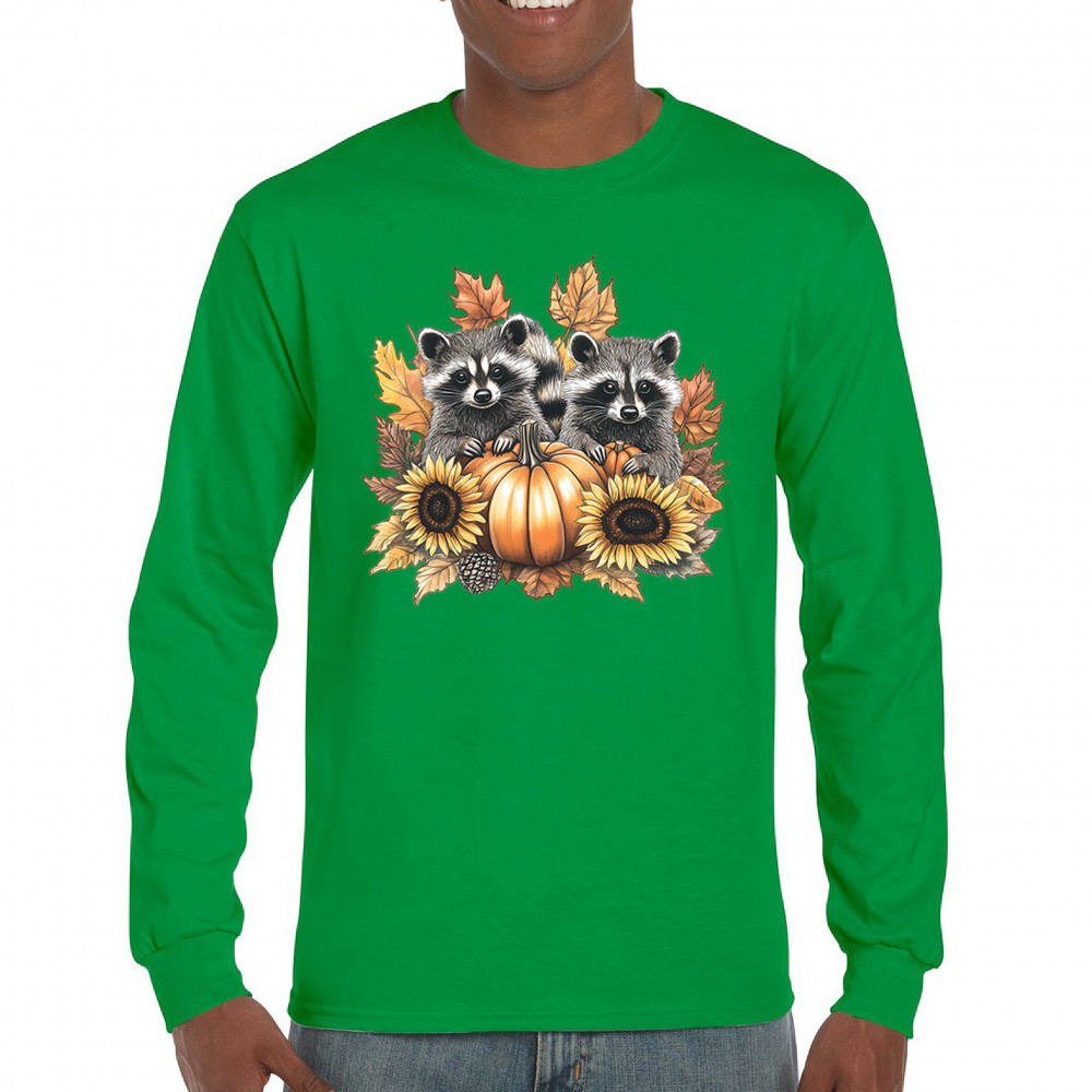 Rustic autumn raccoon design with pumpkins and sunflowers. Perfect for Thanksgiving, pumpkin patch days, farmhouse harvest, and woodland fall fashion.