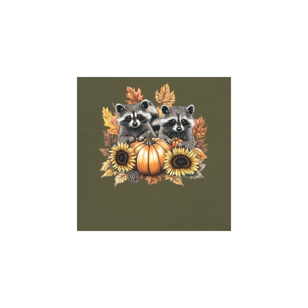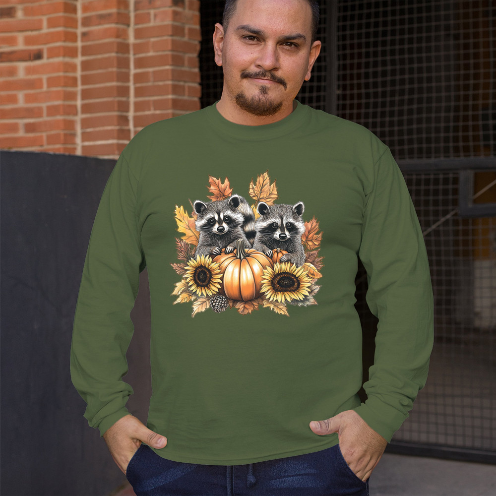 Rustic autumn raccoon design with pumpkins and sunflowers. Perfect for Thanksgiving, pumpkin patch days, farmhouse harvest, and woodland fall fashion.