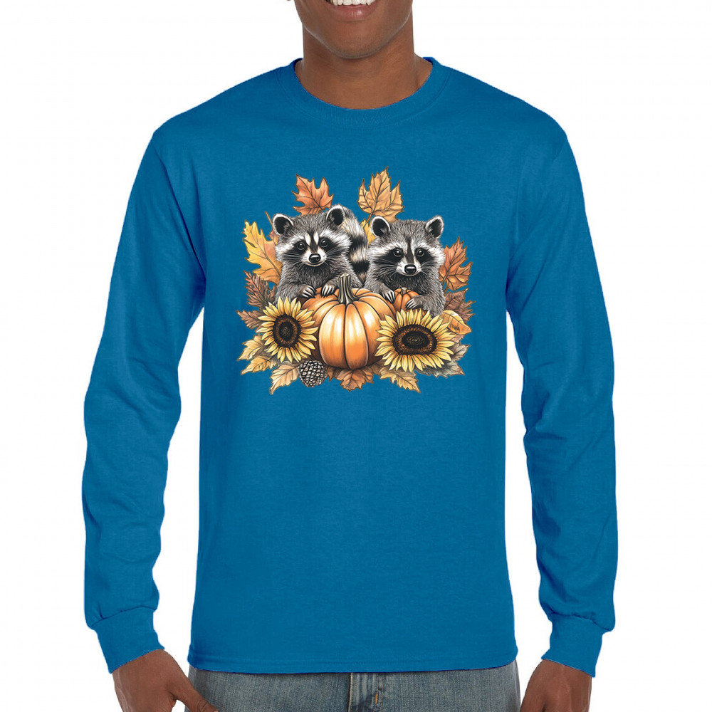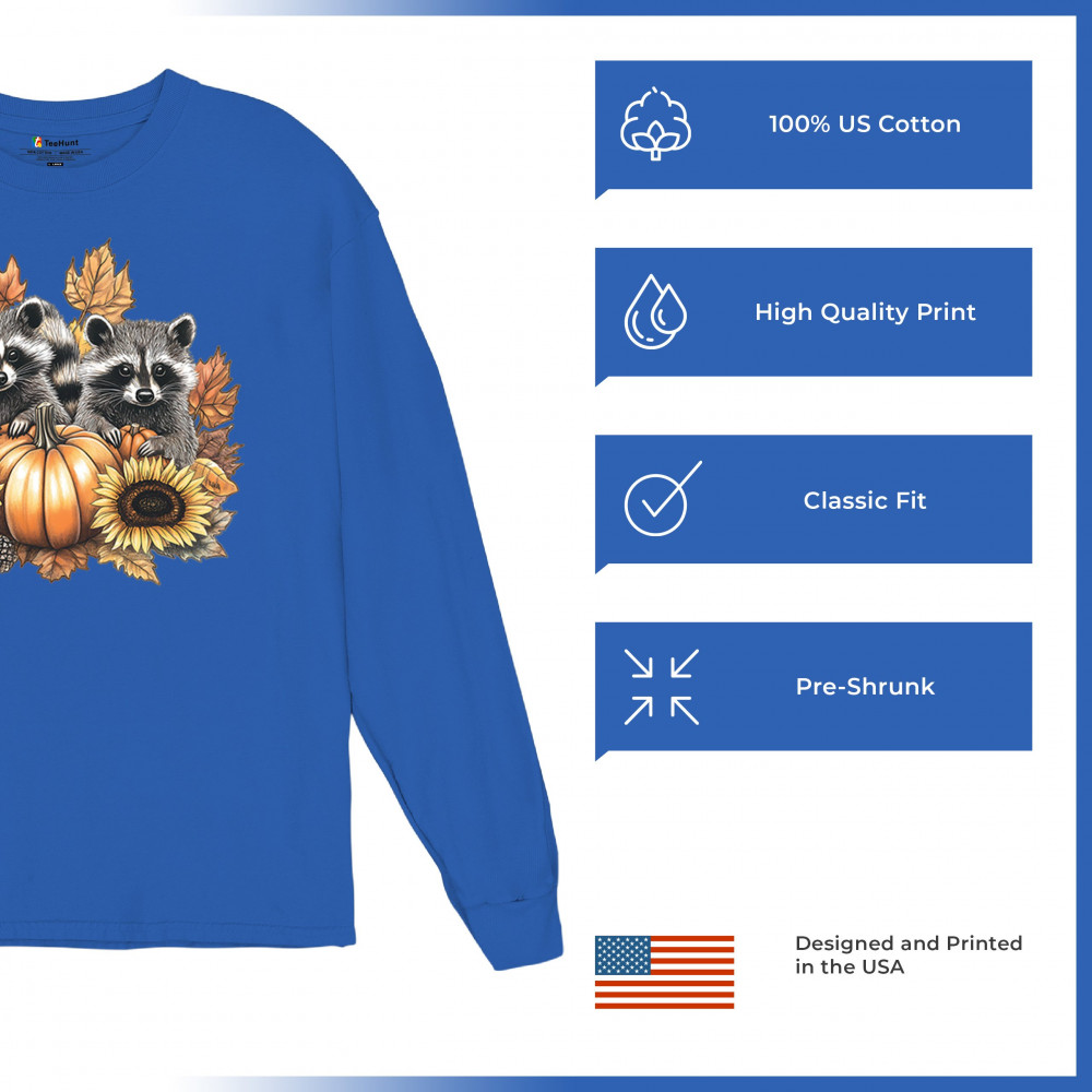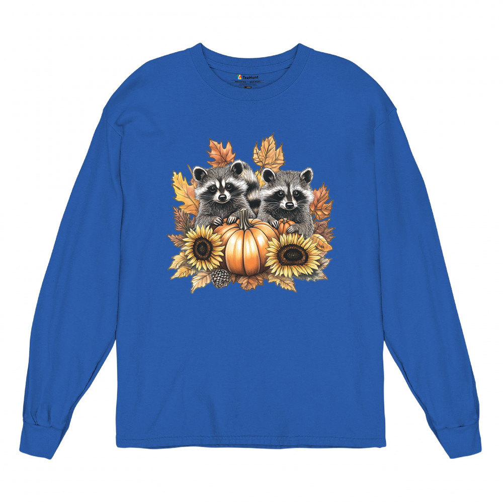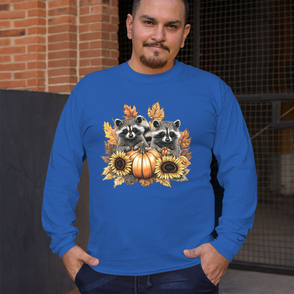 Rustic autumn raccoon design with pumpkins and sunflowers. Perfect for Thanksgiving, pumpkin patch days, farmhouse harvest, and woodland fall fashion.