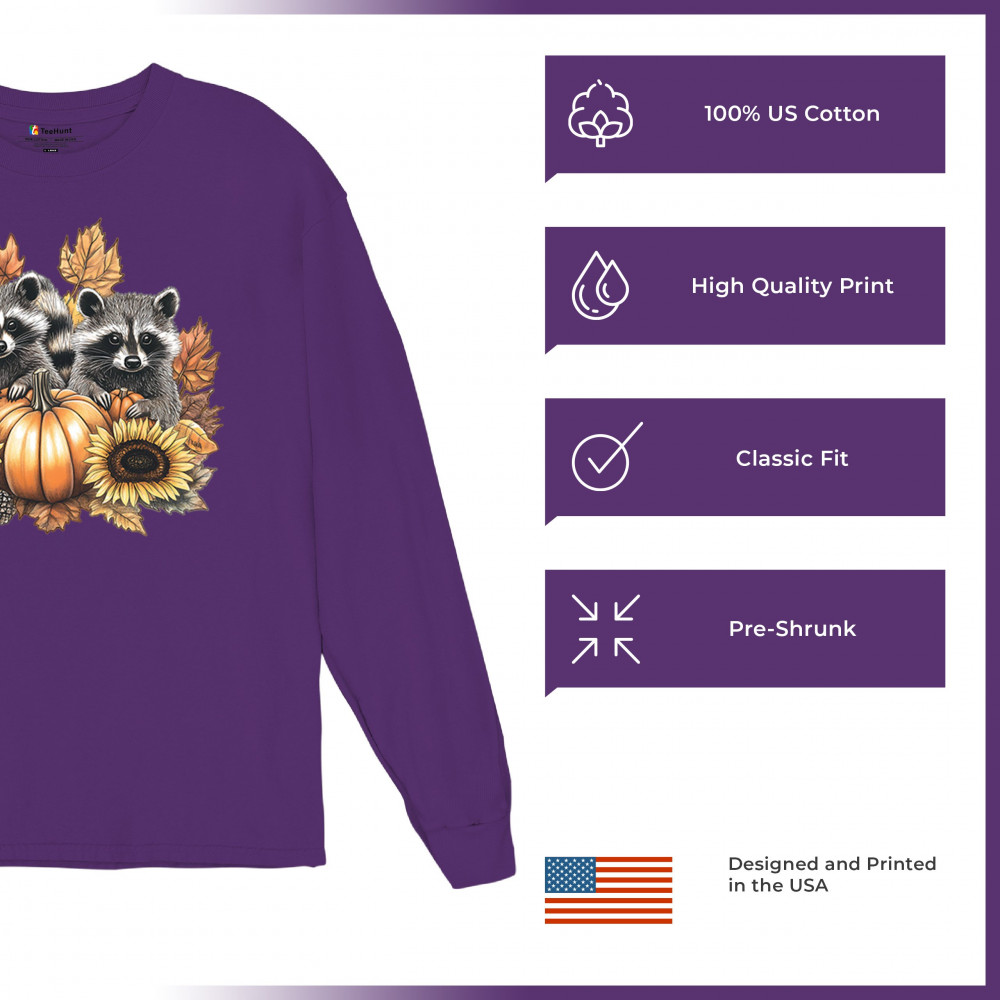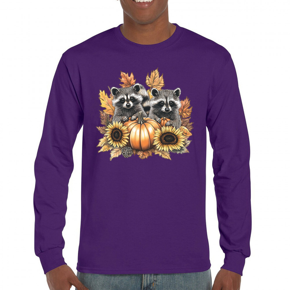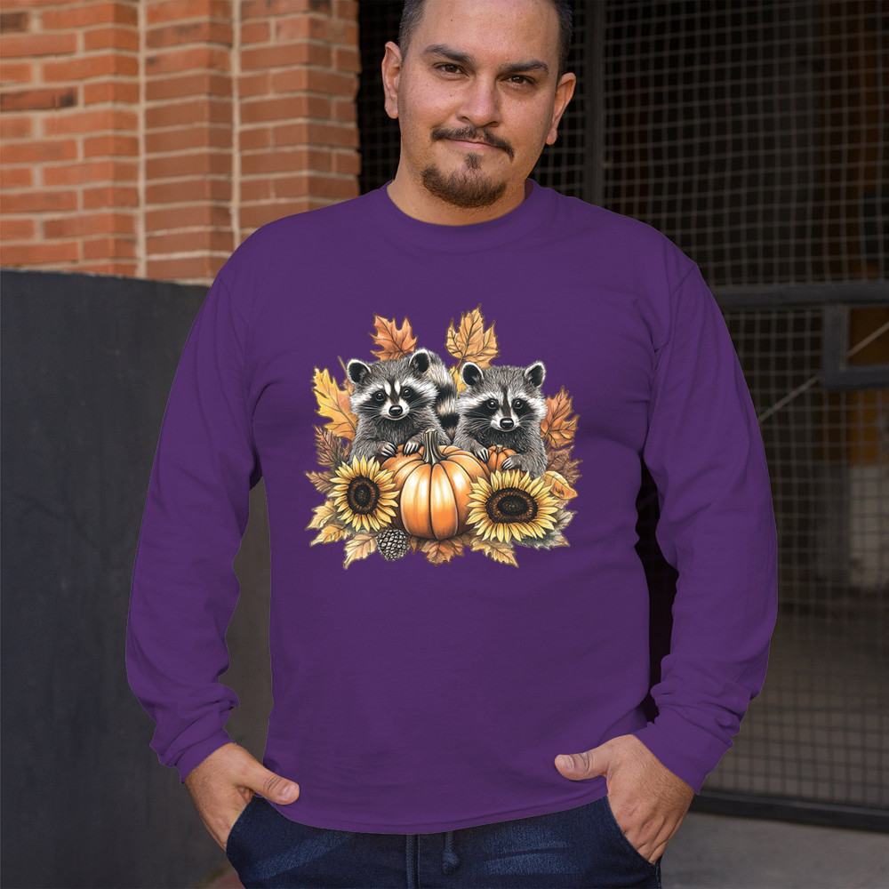 Rustic autumn raccoon design with pumpkins and sunflowers. Perfect for Thanksgiving, pumpkin patch days, farmhouse harvest, and woodland fall fashion.