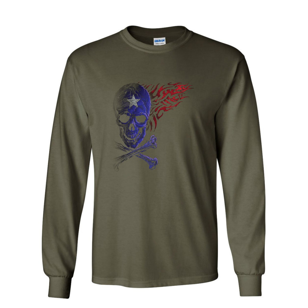 SKULL FACE WITH CROSSBONES fantacycle skull crossbones long sleeve t-shirt american pride tribal flame tee military green
