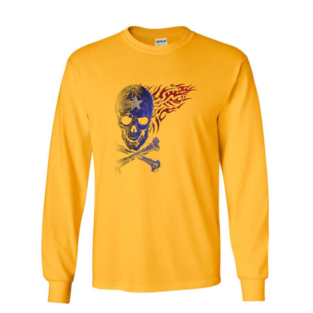 SKULL FACE WITH CROSSBONES fantacycle skull crossbones long sleeve t-shirt american pride tribal flame tee yellow