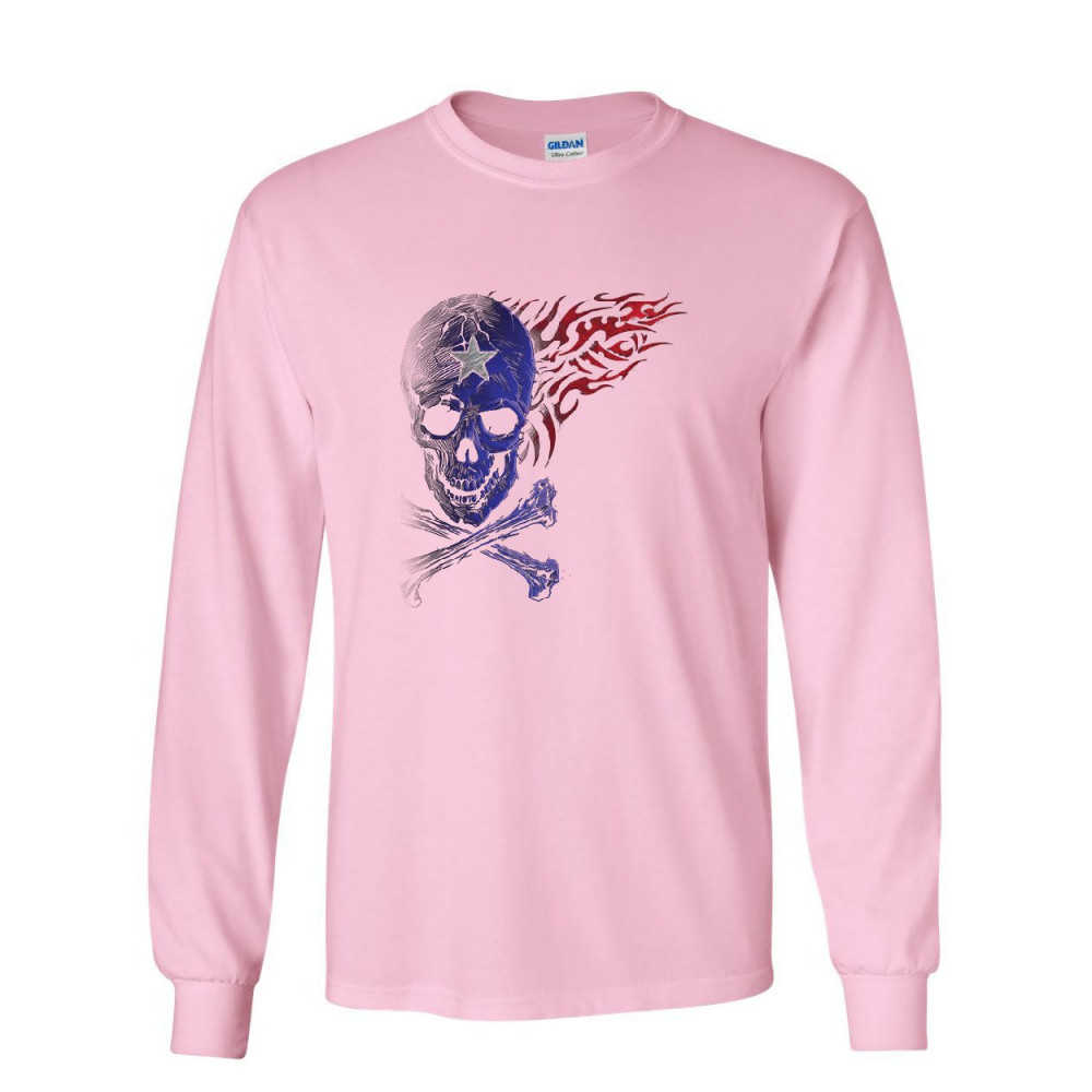 SKULL FACE WITH CROSSBONES fantacycle skull crossbones long sleeve t-shirt american pride tribal flame tee light pink