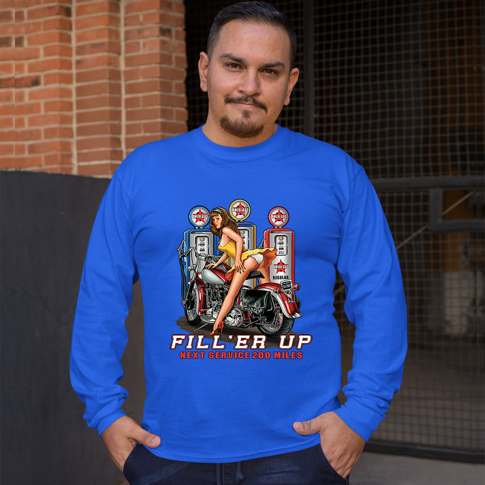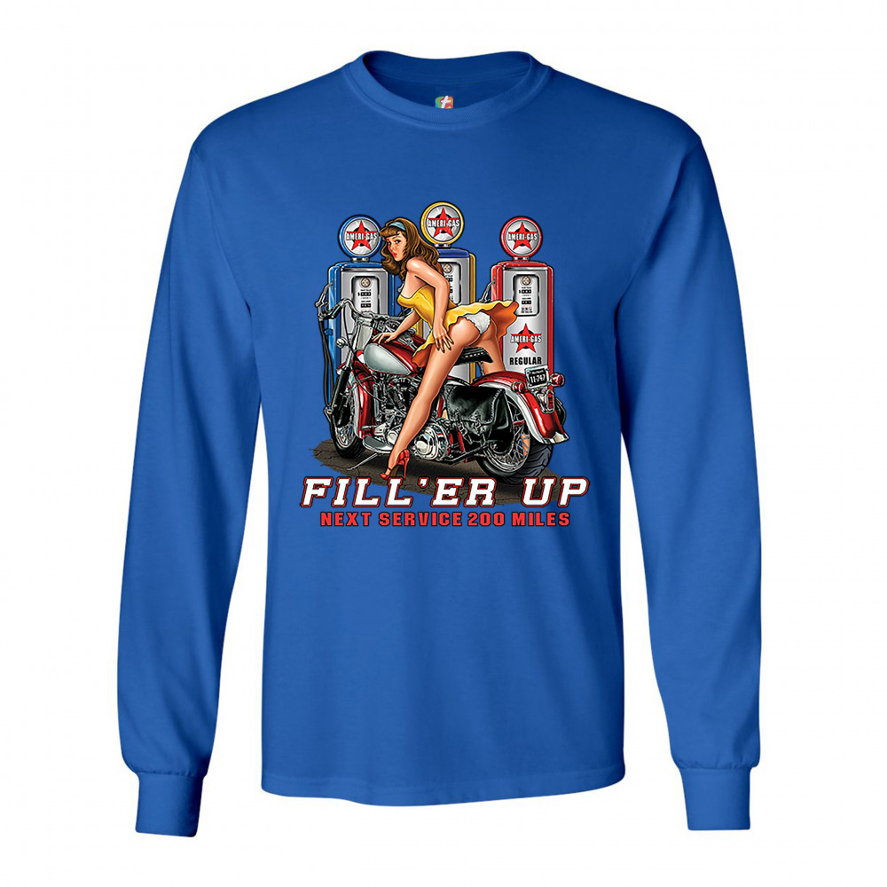 FILL 'ER UP long sleeve t-shirt sexy pin-up girl biker rider live to ride royal blue