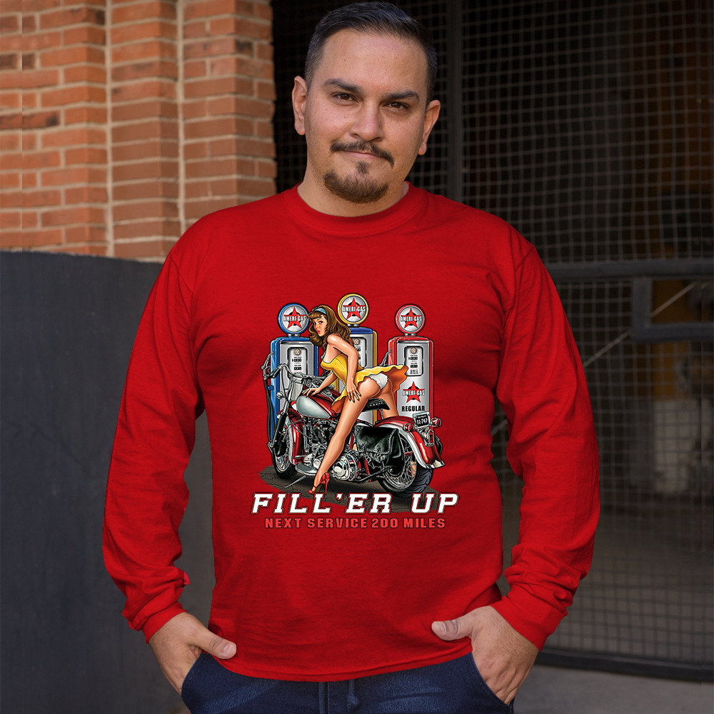 FILL 'ER UP long sleeve t-shirt sexy pin-up girl biker rider live to ride red