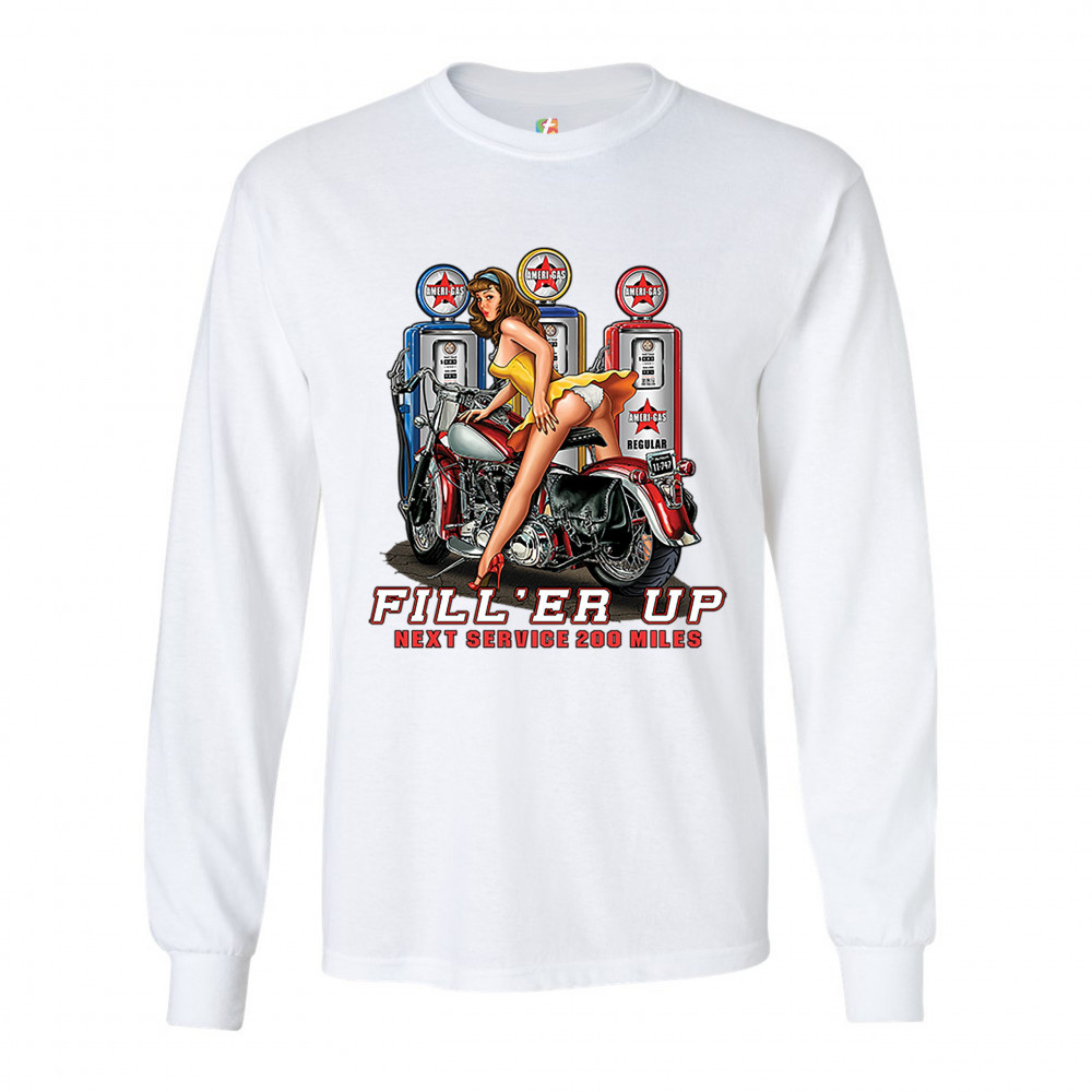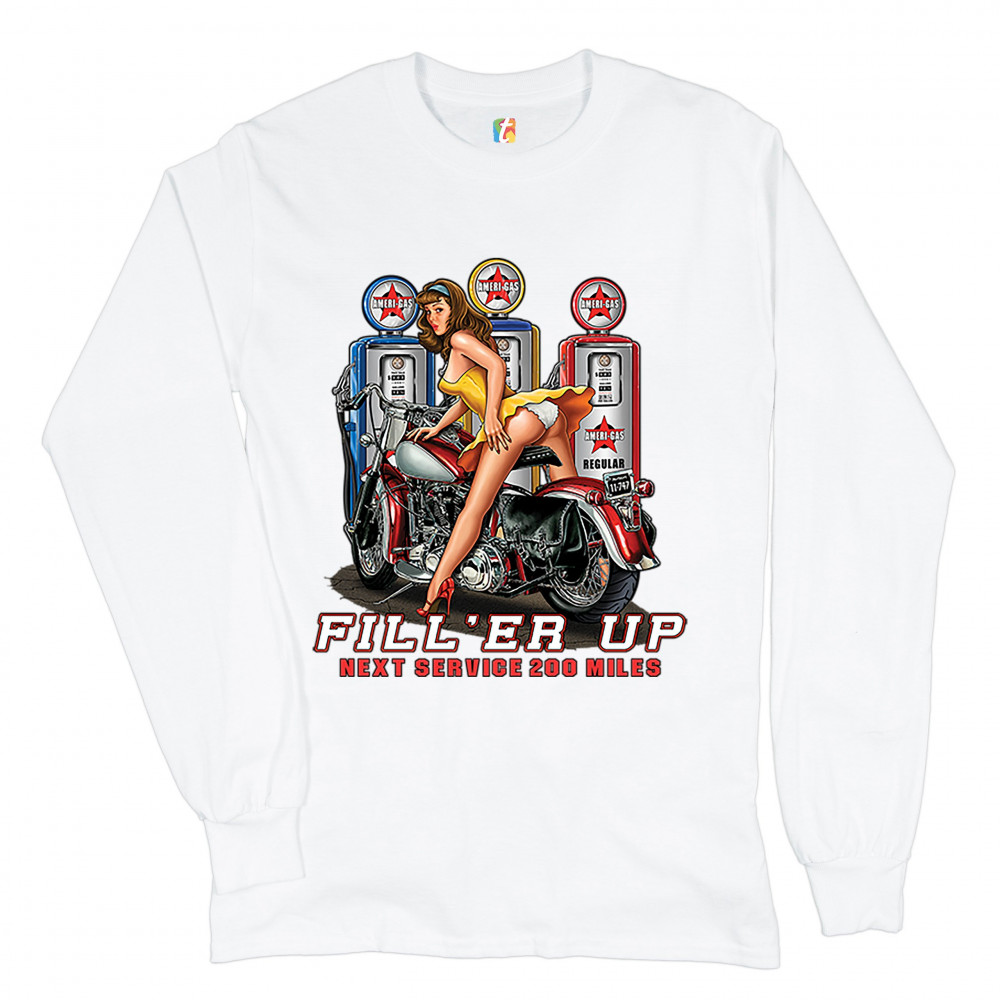 FILL 'ER UP long sleeve t-shirt sexy pin-up girl biker rider live to ride white