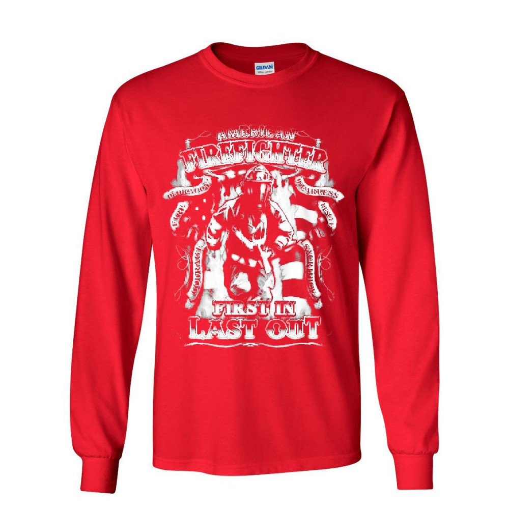 AMERICAN FIREFIGHTER FIRST IN LAST OUT long sleeve t-shirt fire rescue red