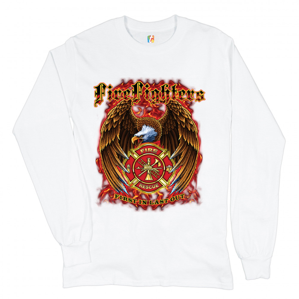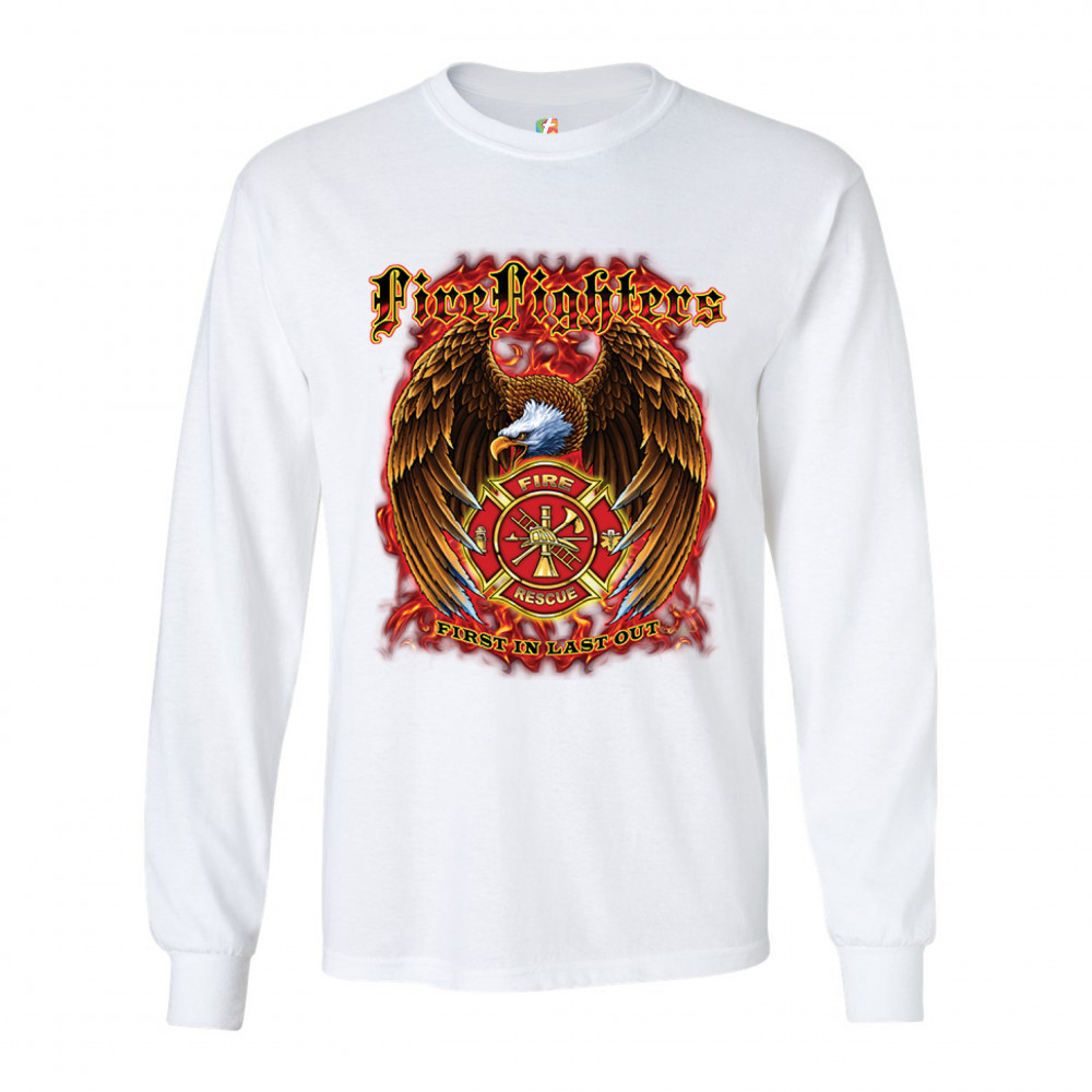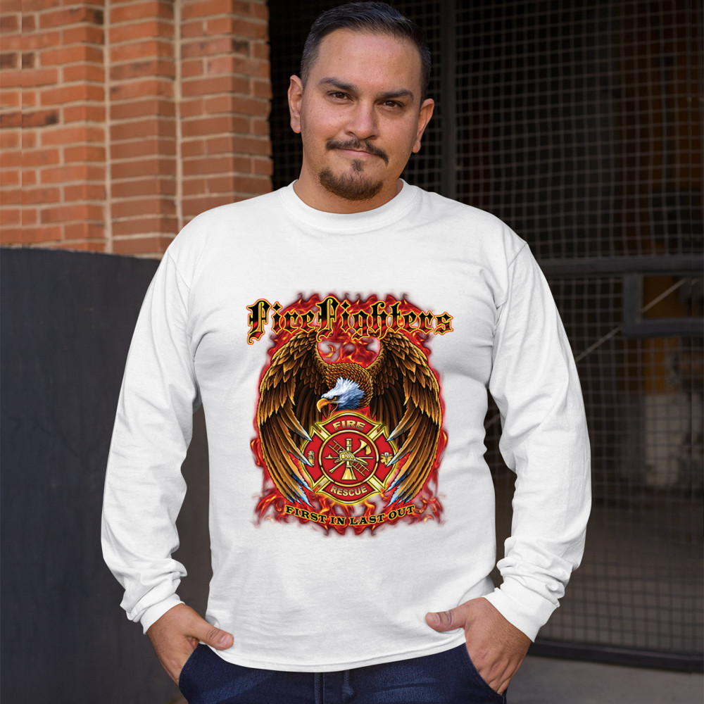 FIREFIGHTERS FIRST IN LAST OUT long sleeve t-shirt fire and rescue bald eagle white