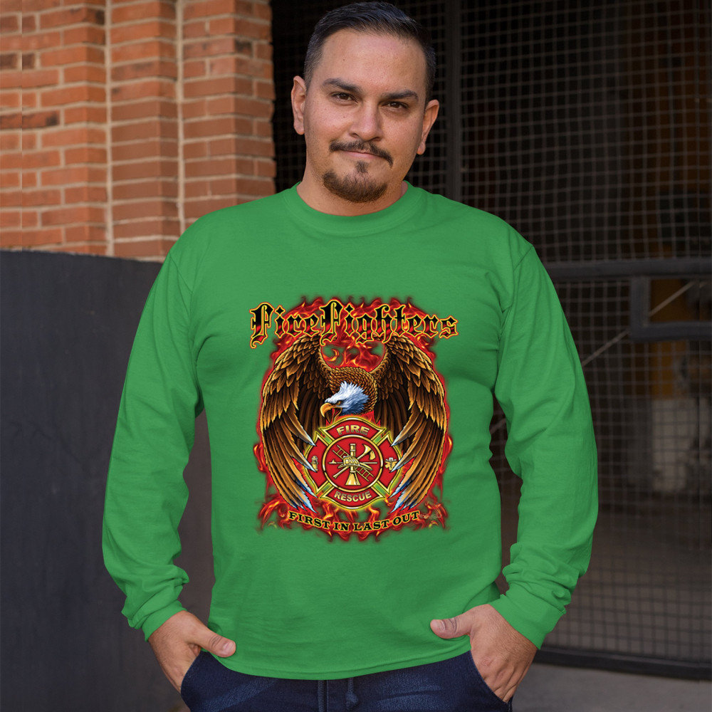 FIREFIGHTERS FIRST IN LAST OUT long sleeve t-shirt fire and rescue bald eagle green