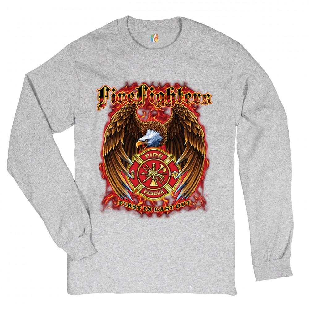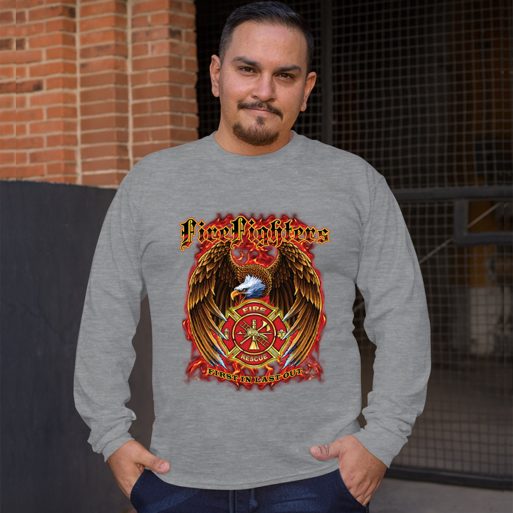 FIREFIGHTERS FIRST IN LAST OUT long sleeve t-shirt fire and rescue bald eagle gray