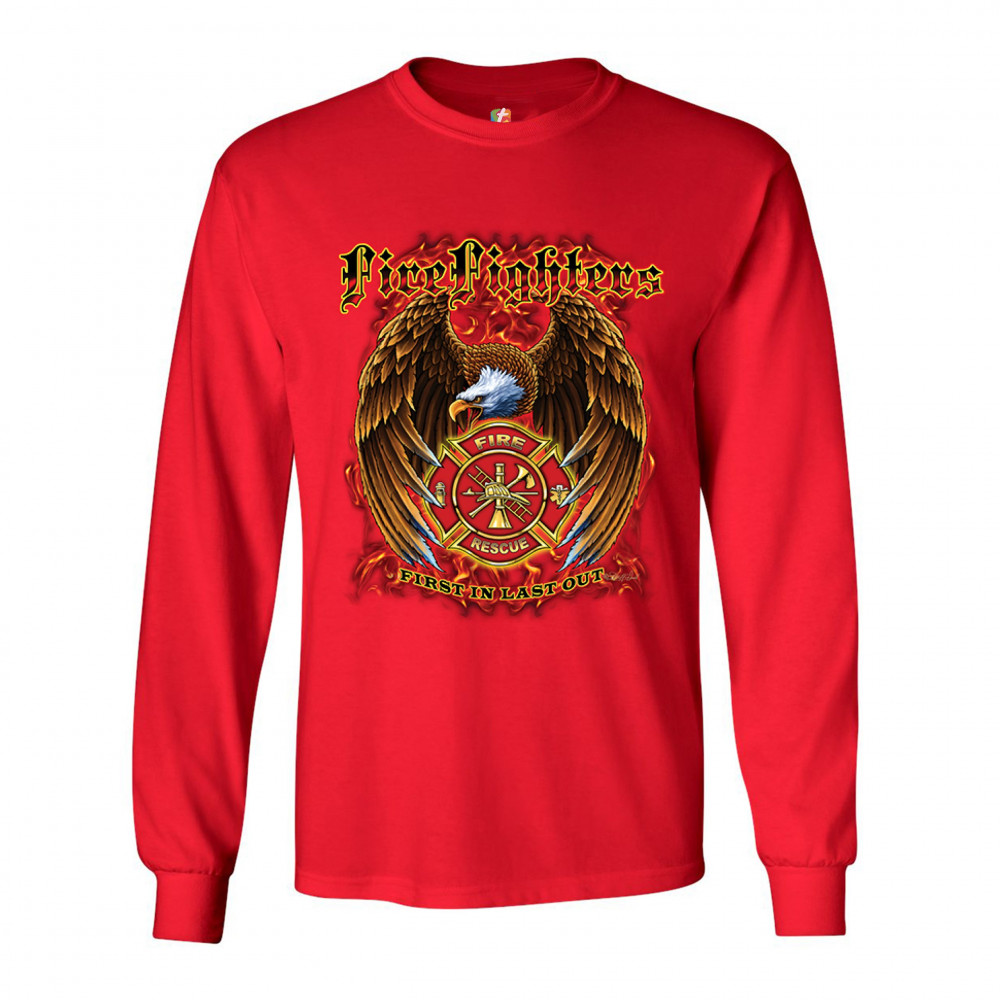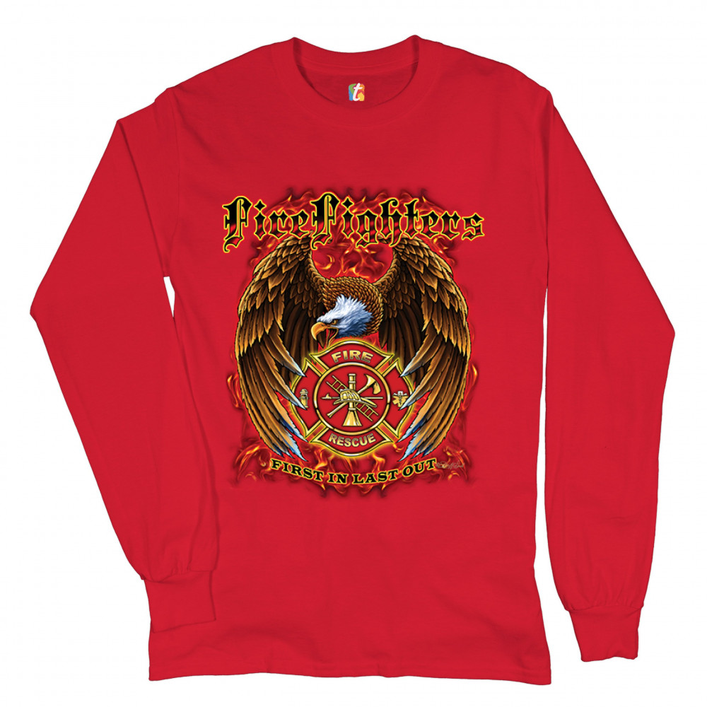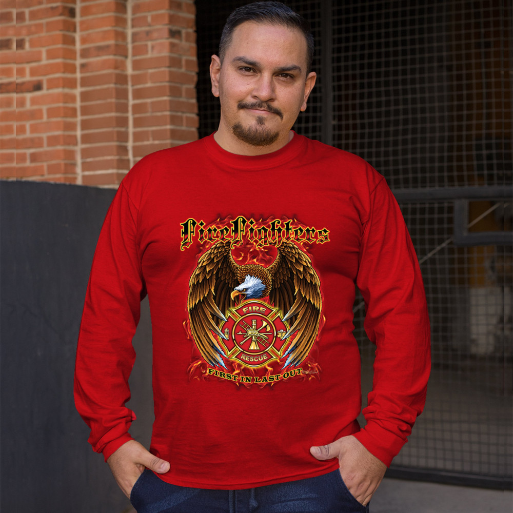 FIREFIGHTERS FIRST IN LAST OUT long sleeve t-shirt fire and rescue bald eagle red