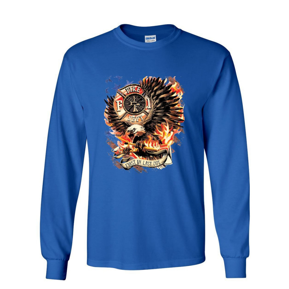 FIREFIGHTER FIRST IN LAST OUT first in last out long sleeve t-shirt fire & rescue fd american firefighter tee royal blue