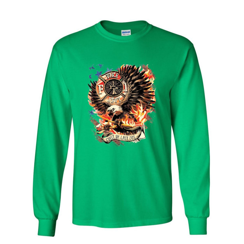 FIREFIGHTER FIRST IN LAST OUT first in last out long sleeve t-shirt fire & rescue fd american firefighter tee green