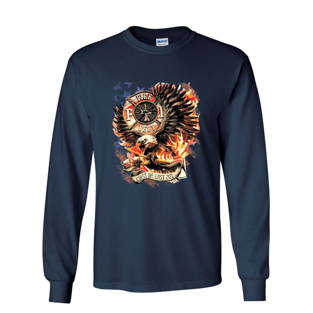 FIREFIGHTER FIRST IN LAST OUT first in last out long sleeve t-shirt fire & rescue fd american firefighter tee navy blue