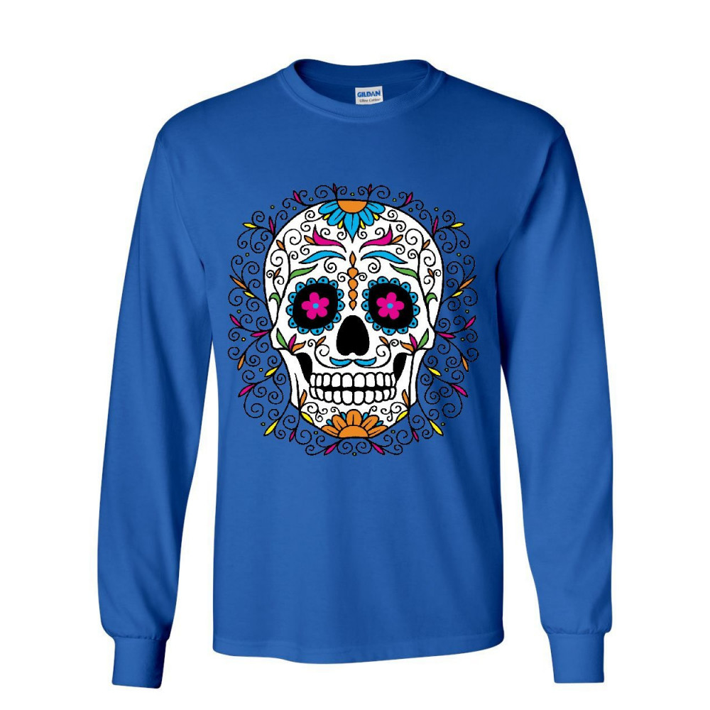 FLORAL SUGAR SKULL DAY OF THE DEAD long sleeve t-shirt calavera royal blue