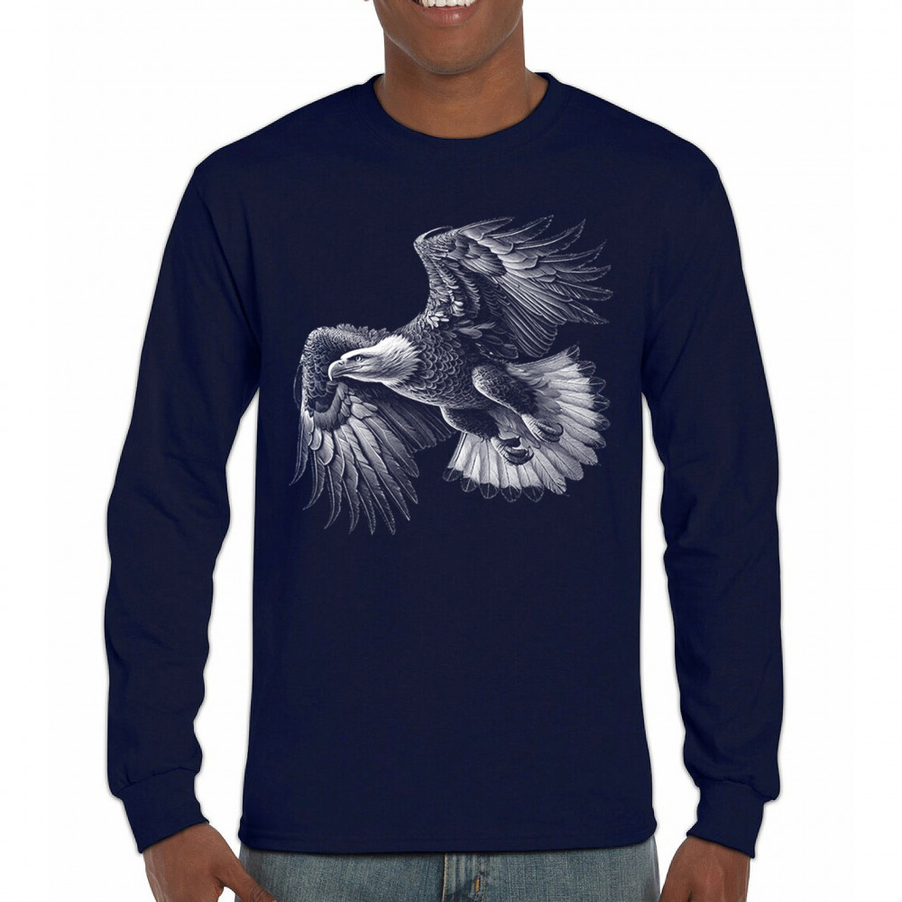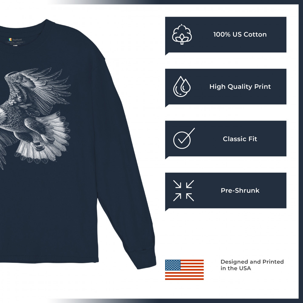 Celebrate American pride with this soaring bald eagle design. With wings extended and monochrome detail that symbolizes liberty and strength, it's perfect for patriots, veterans, and national holiday wear. A timeless tribute to freedom, this design is ideal for memorial events, rallies, and anyone who honors the red, white, and blue.