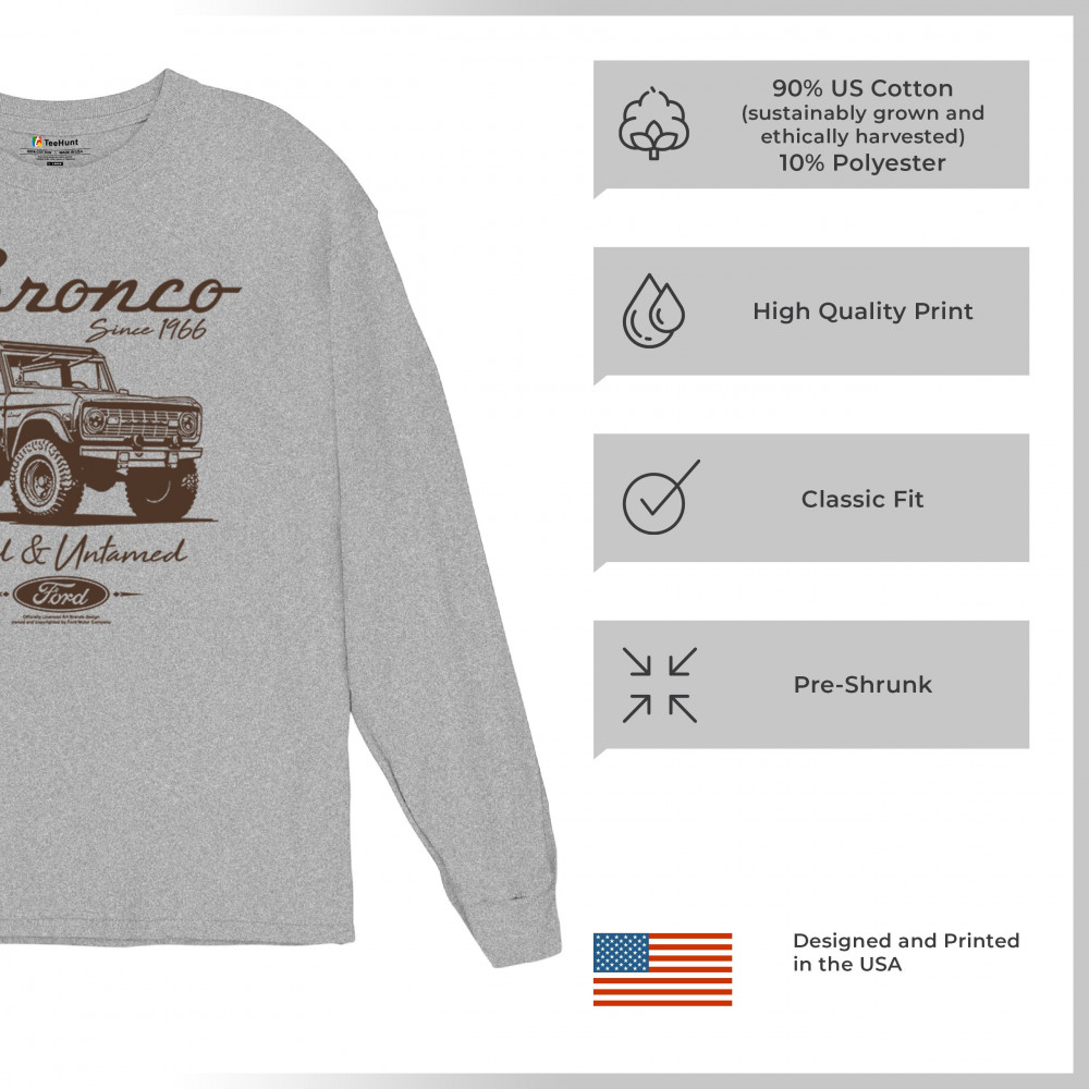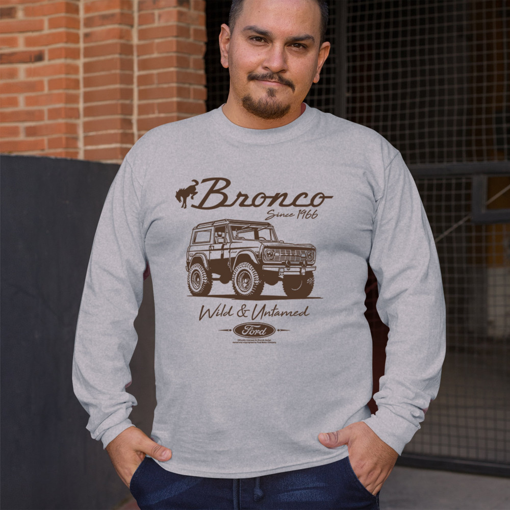 Discover the perfect gift for Ford Bronco enthusiasts with this officially licensed apparel. Highlighting "Bronco Since 1966" and "Wild and Untamed," the design captures the rugged charm of this iconic off-road SUV. Ideal for classic car lovers, outdoor explorers, and 4x4 adventurers, this vintage collectible represents the adventure-ready spirit of the Bronco.