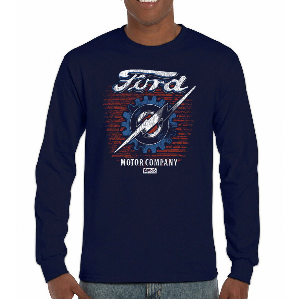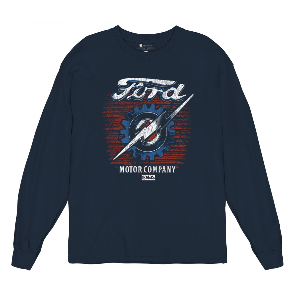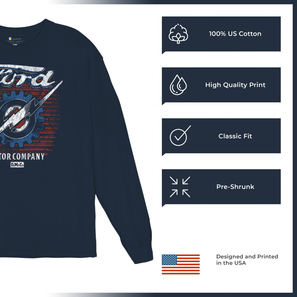 Honor Ford Motor Company’s legacy with this officially licensed vintage design, featuring a lightning bolt, distressed flag, and FoMoCo heritage.