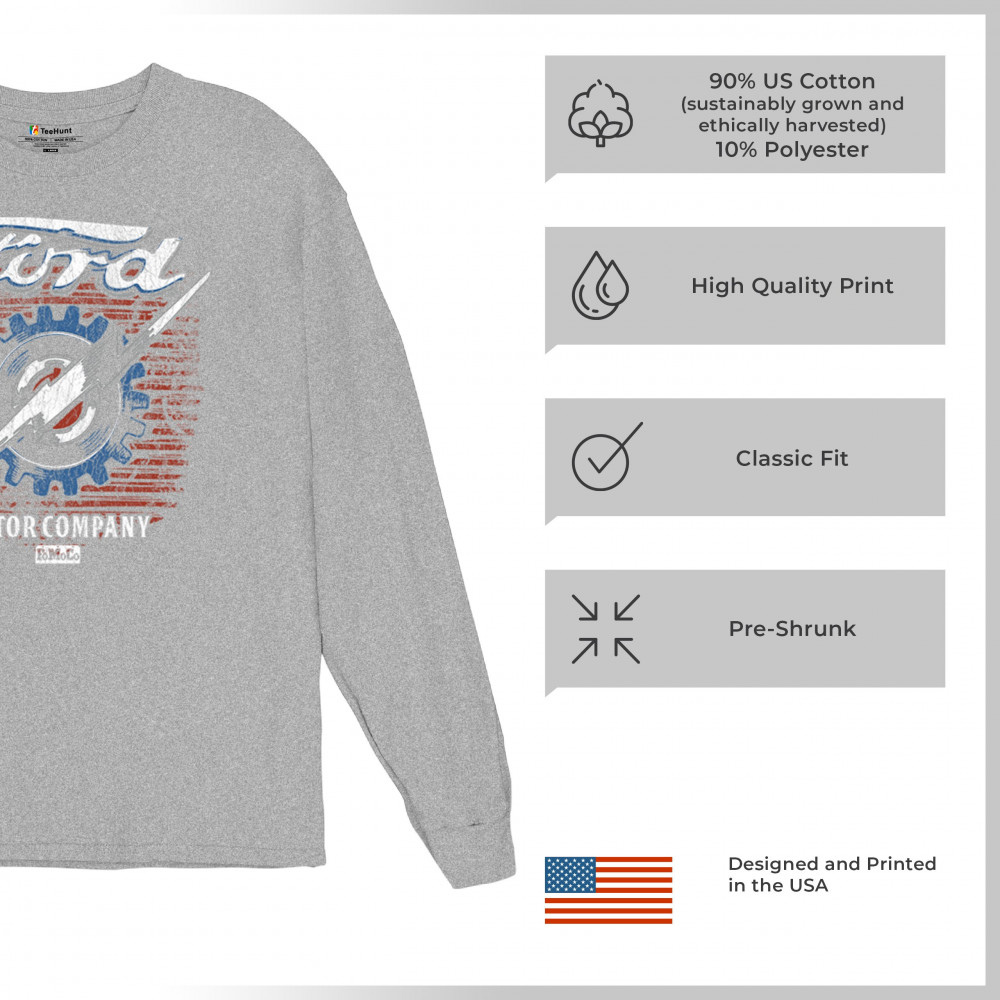 Honor Ford Motor Company’s legacy with this officially licensed vintage design, featuring a lightning bolt, distressed flag, and FoMoCo heritage.