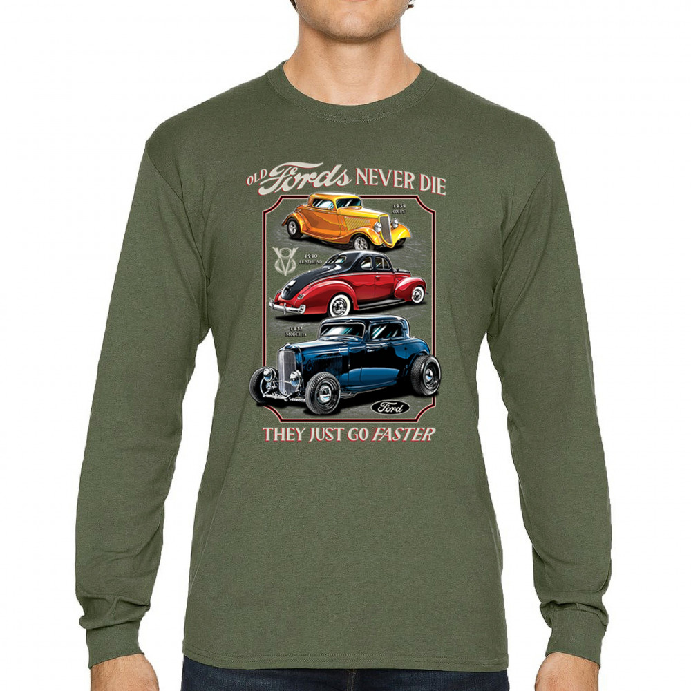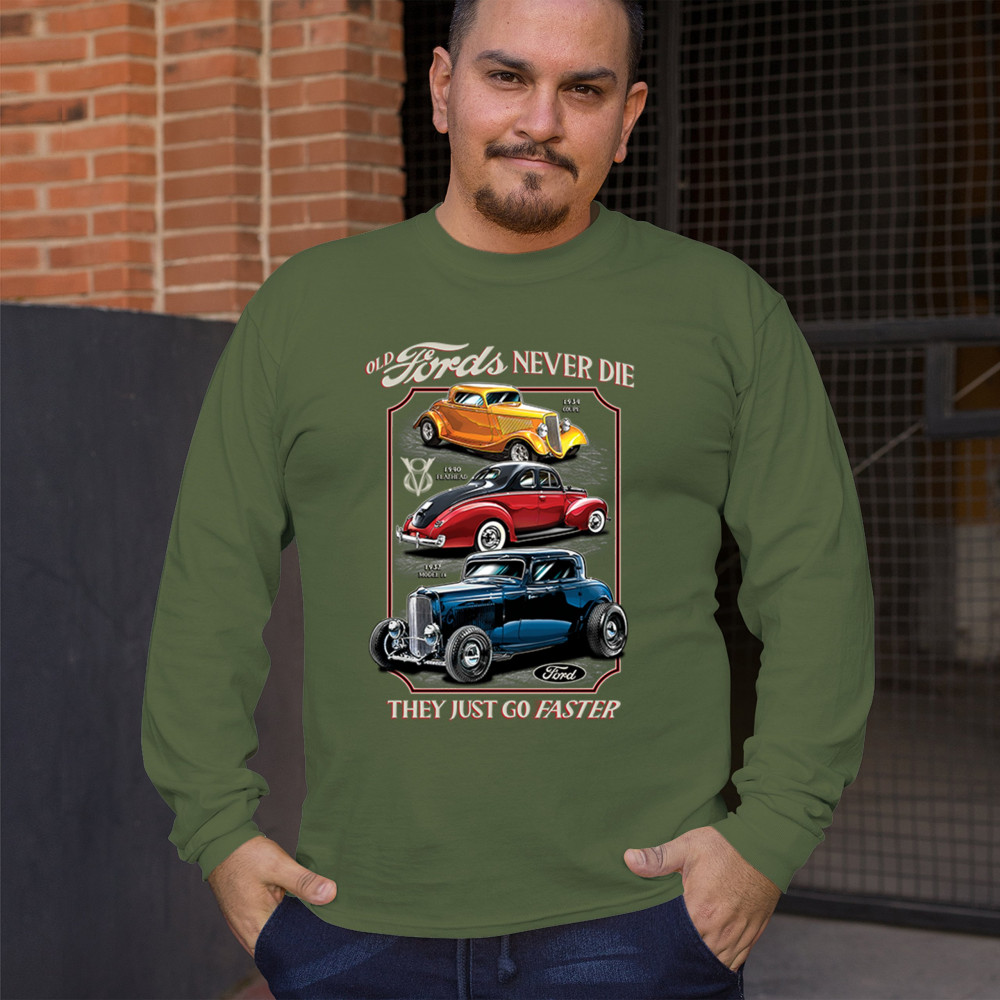 This retro design features three legendary Ford hot rods from the 1930s and 1940s, boldly rendered in a tribute to American street rod history. Ideal for muscle car lovers, vintage performance fans, and classic car culture enthusiasts who appreciate timeless speed. A must-have for cruise nights, garage hangs, and car shows.