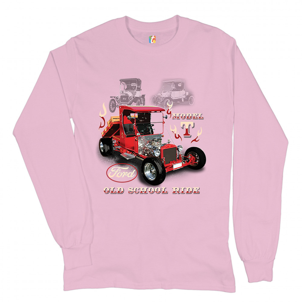 A print featuring a Ford Model T modified as a hot rod. The are also two transparent pictures of original T Models in the background. The print features the Ford logo and says: "Model T, Old School Ride". A great choice for anyone who is a fan of old sch