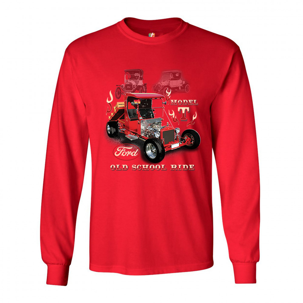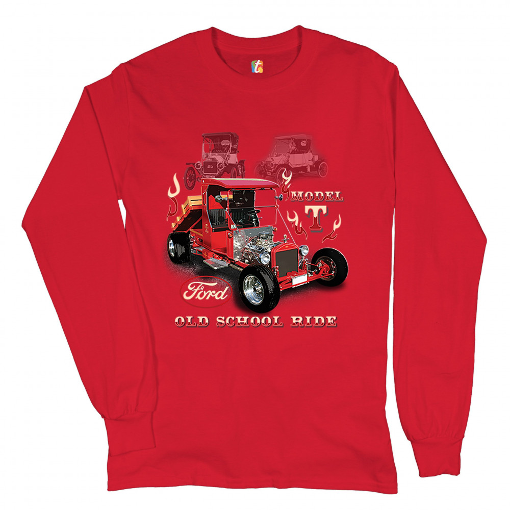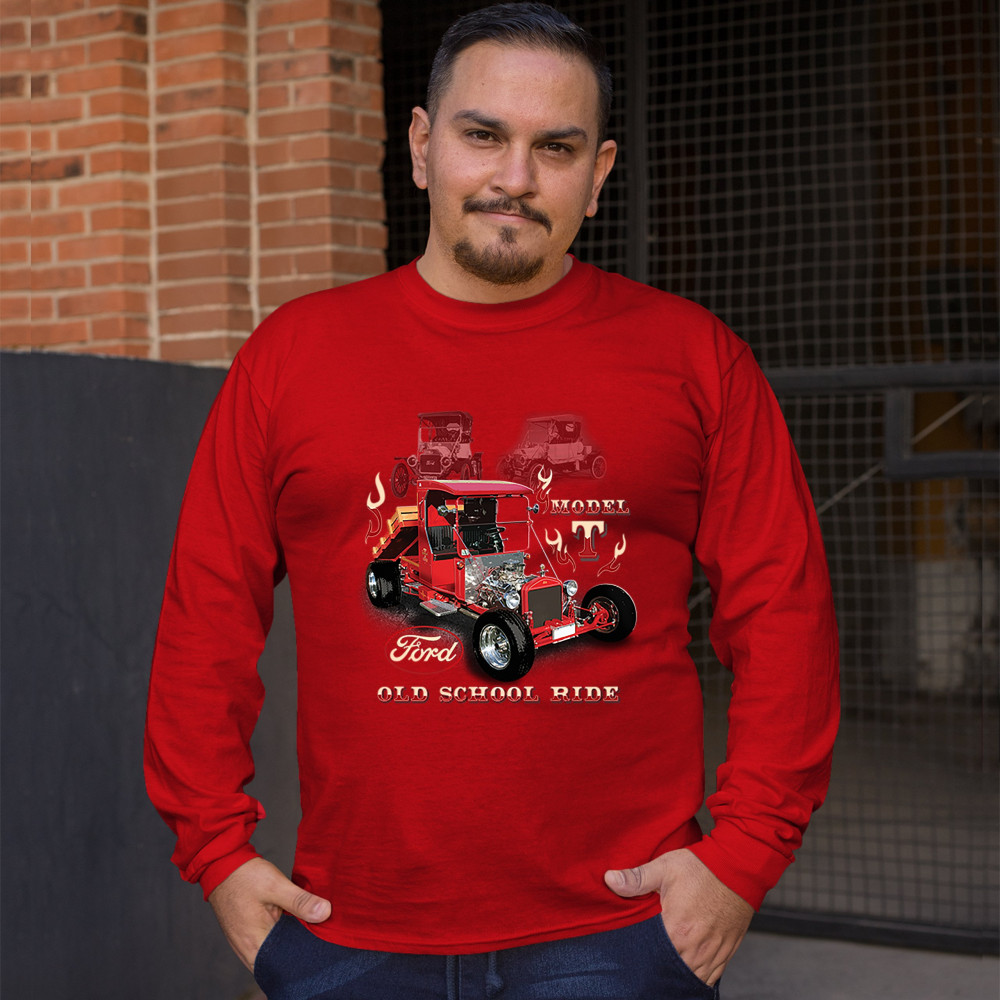 A print featuring a Ford Model T modified as a hot rod. The are also two transparent pictures of original T Models in the background. The print features the Ford logo and says: "Model T, Old School Ride". A great choice for anyone who is a fan of old sch
