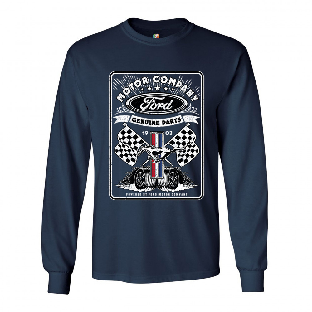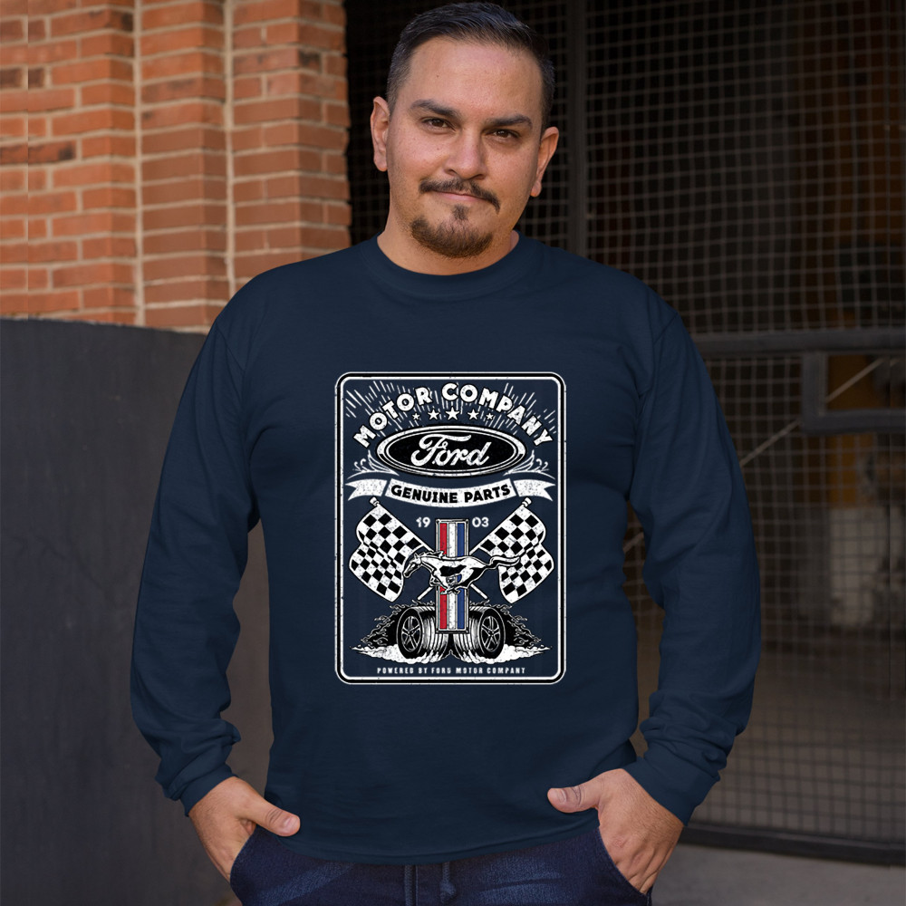 A print featuring Ford logo in the top, Mustang logo in the center, two racing flags and two rolling wheels. The prints says: "Ford Motor Company Genuine Parts 1903" in the top and "Powered by Ford Motor Company" in the bottom. A great choice for anyone w