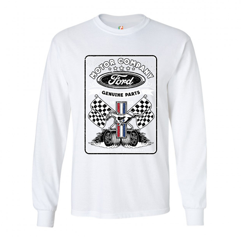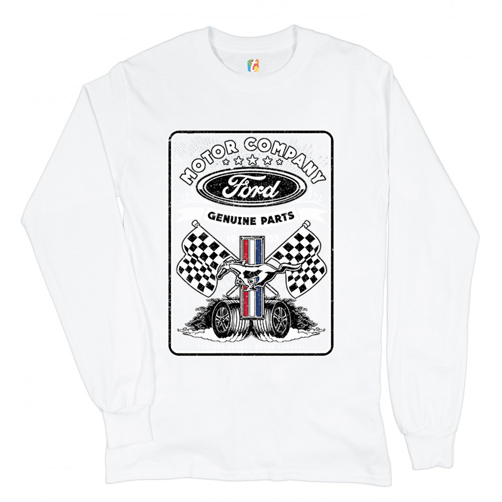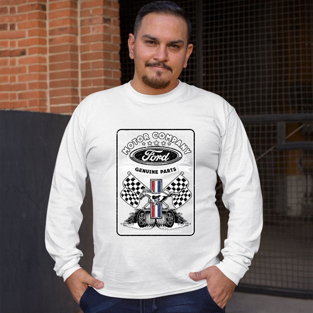 A print featuring Ford logo in the top, Mustang logo in the center, two racing flags and two rolling wheels. The prints says: "Ford Motor Company Genuine Parts 1903" in the top and "Powered by Ford Motor Company" in the bottom. A great choice for anyone w