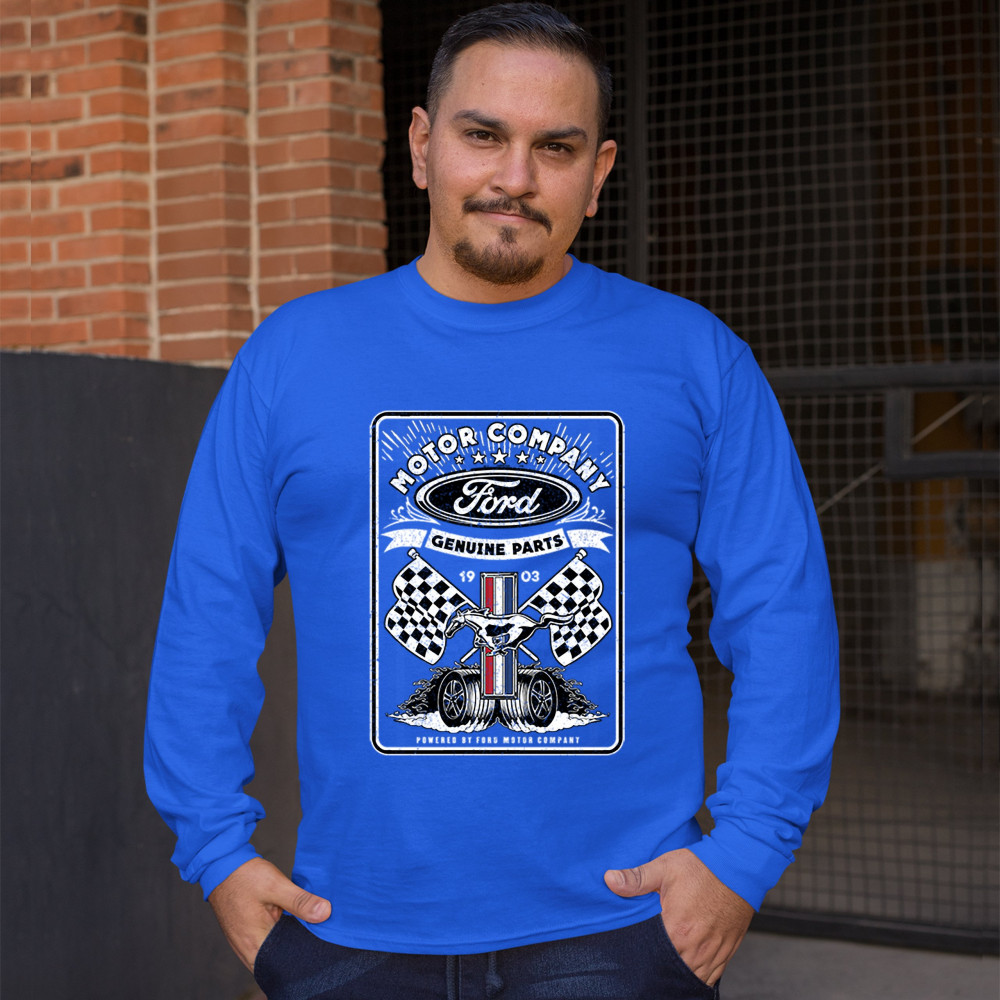 A print featuring Ford logo in the top, Mustang logo in the center, two racing flags and two rolling wheels. The prints says: "Ford Motor Company Genuine Parts 1903" in the top and "Powered by Ford Motor Company" in the bottom. A great choice for anyone w