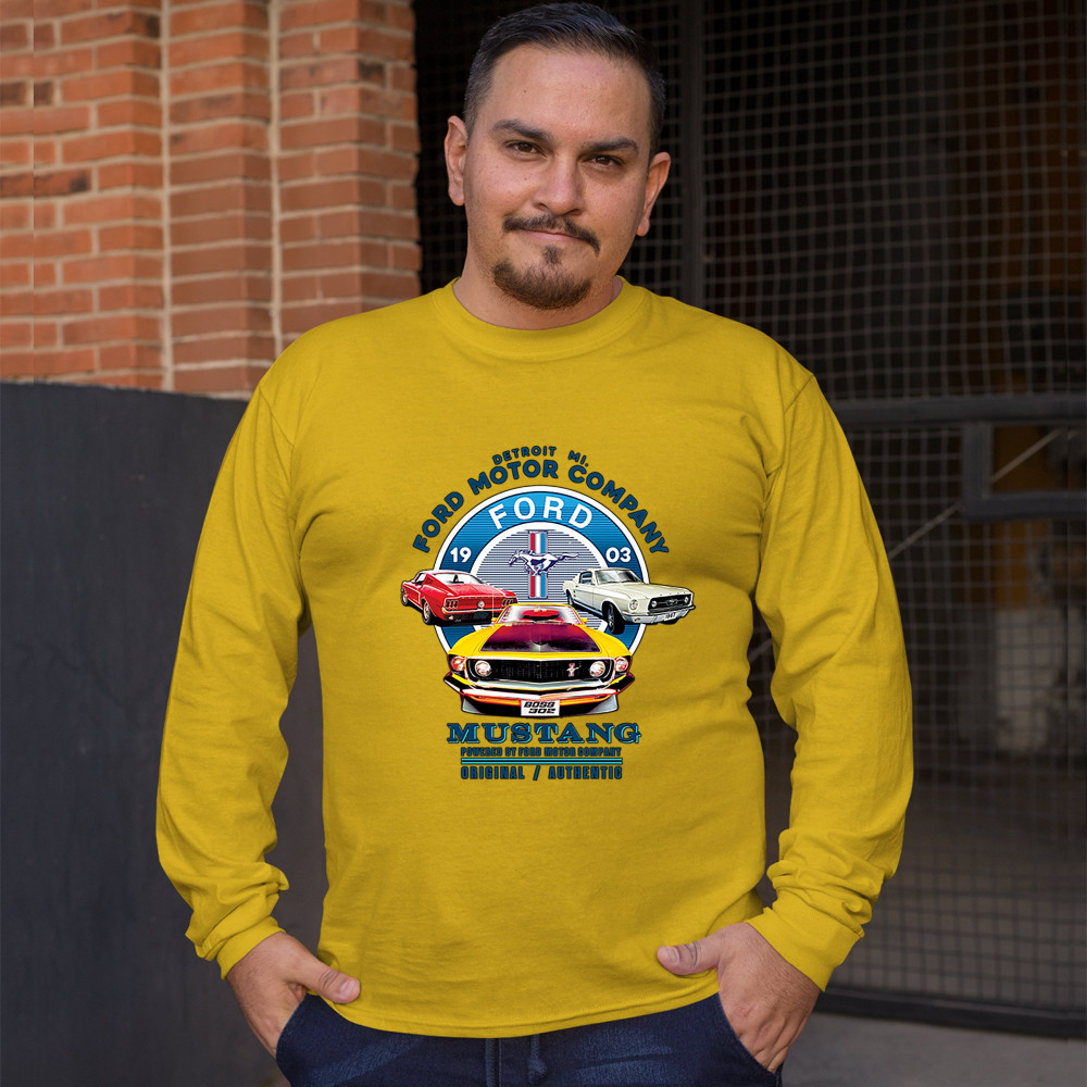 A print featuring three classic Ford Mustangs and their logo in the center. The print says: "Detroit Mi. Ford Motor Company, 1903 Ford Mustang, Powered by Ford Motor Company, Original/Authentic". A great choice for anyone who is a fan of old school Ford M