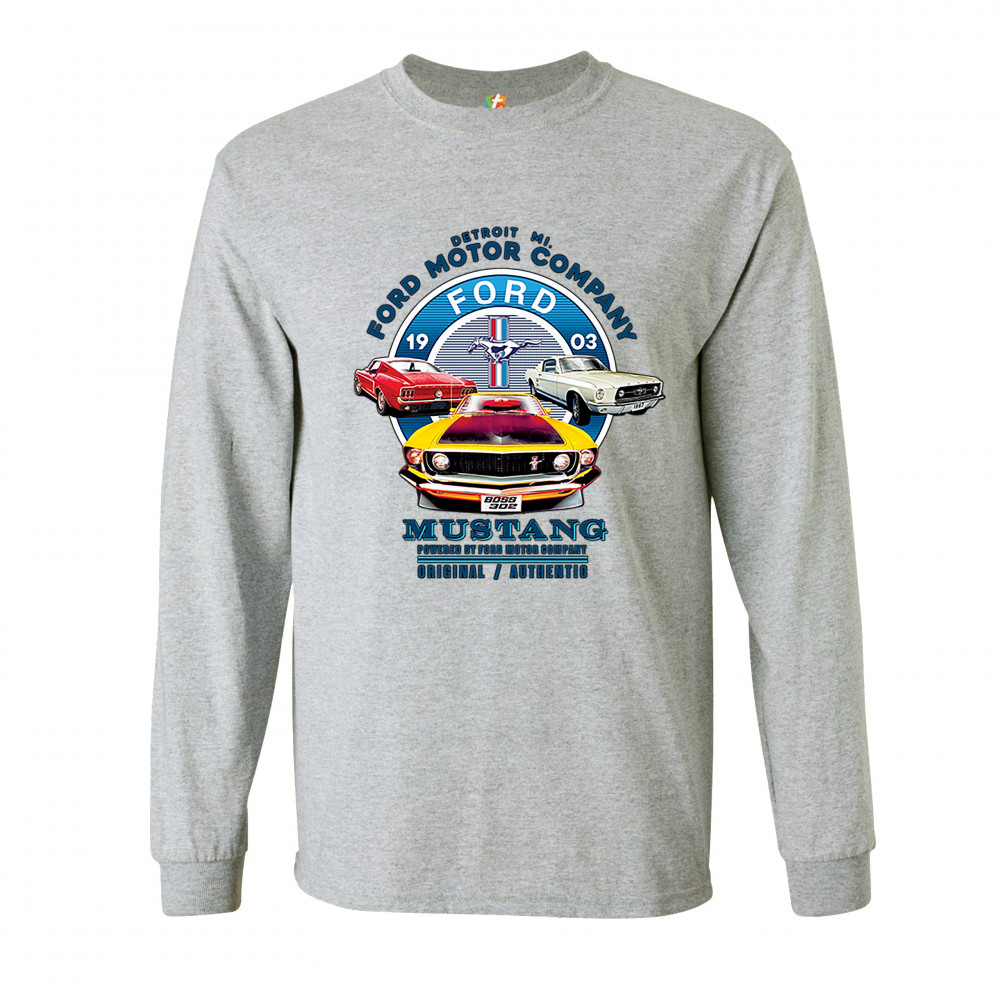 A print featuring three classic Ford Mustangs and their logo in the center. The print says: "Detroit Mi. Ford Motor Company, 1903 Ford Mustang, Powered by Ford Motor Company, Original/Authentic". A great choice for anyone who is a fan of old school Ford M