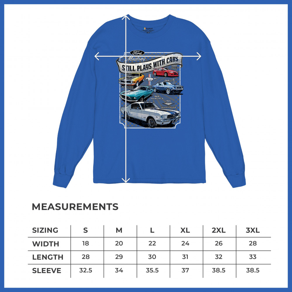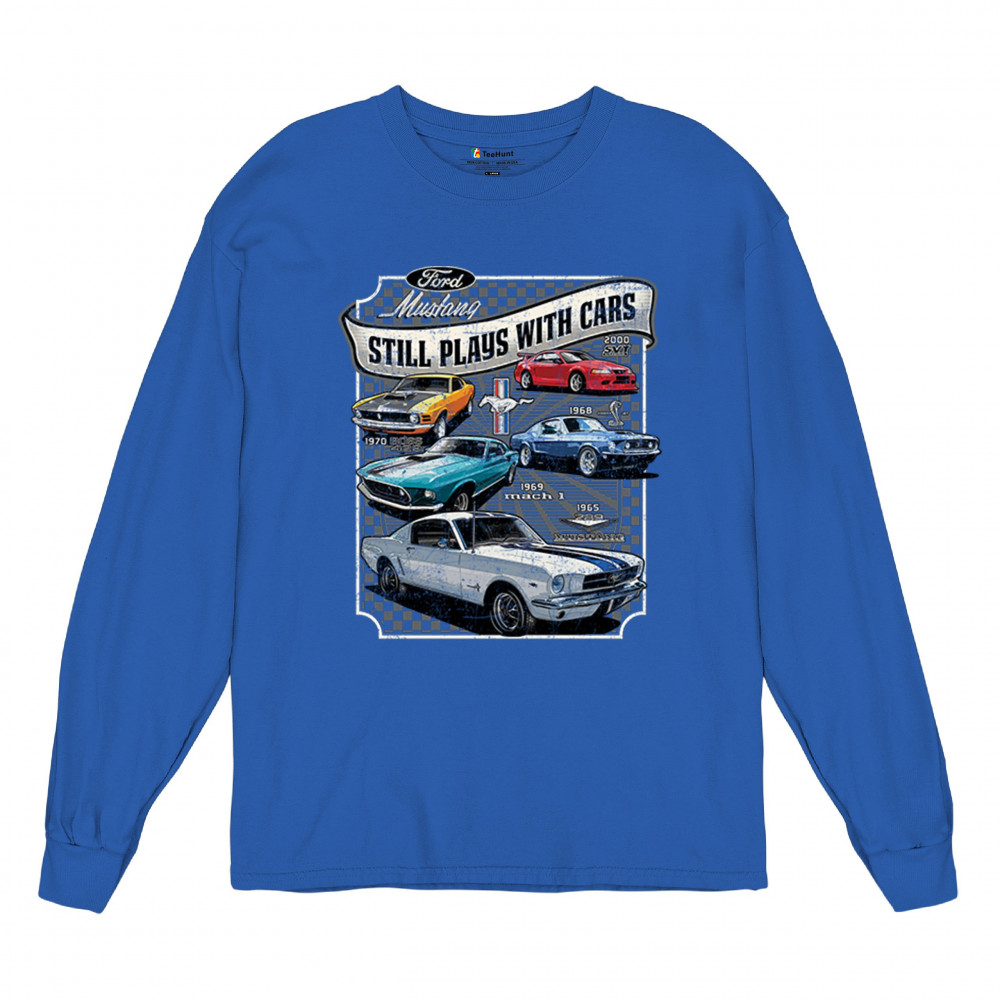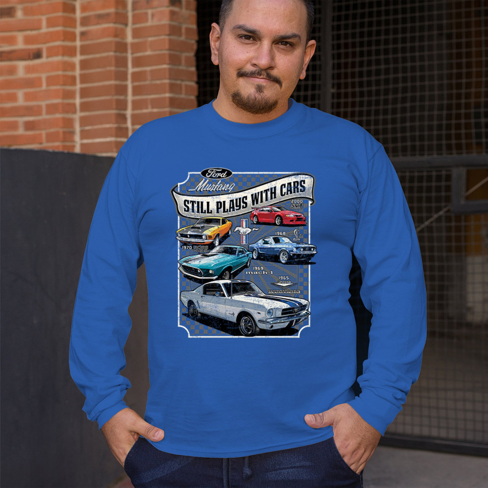 This bold Ford Mustang "Still Plays With Cars" design showcases six classic models from 1965 to 2000, including the 1969 Mach 1, 1970 Boss 302, and 2000 SVT. A dream graphic for muscle car lovers, collectors, and pony car fans. Great for classic auto shows, retro cruises, garage wear, or car clubs.