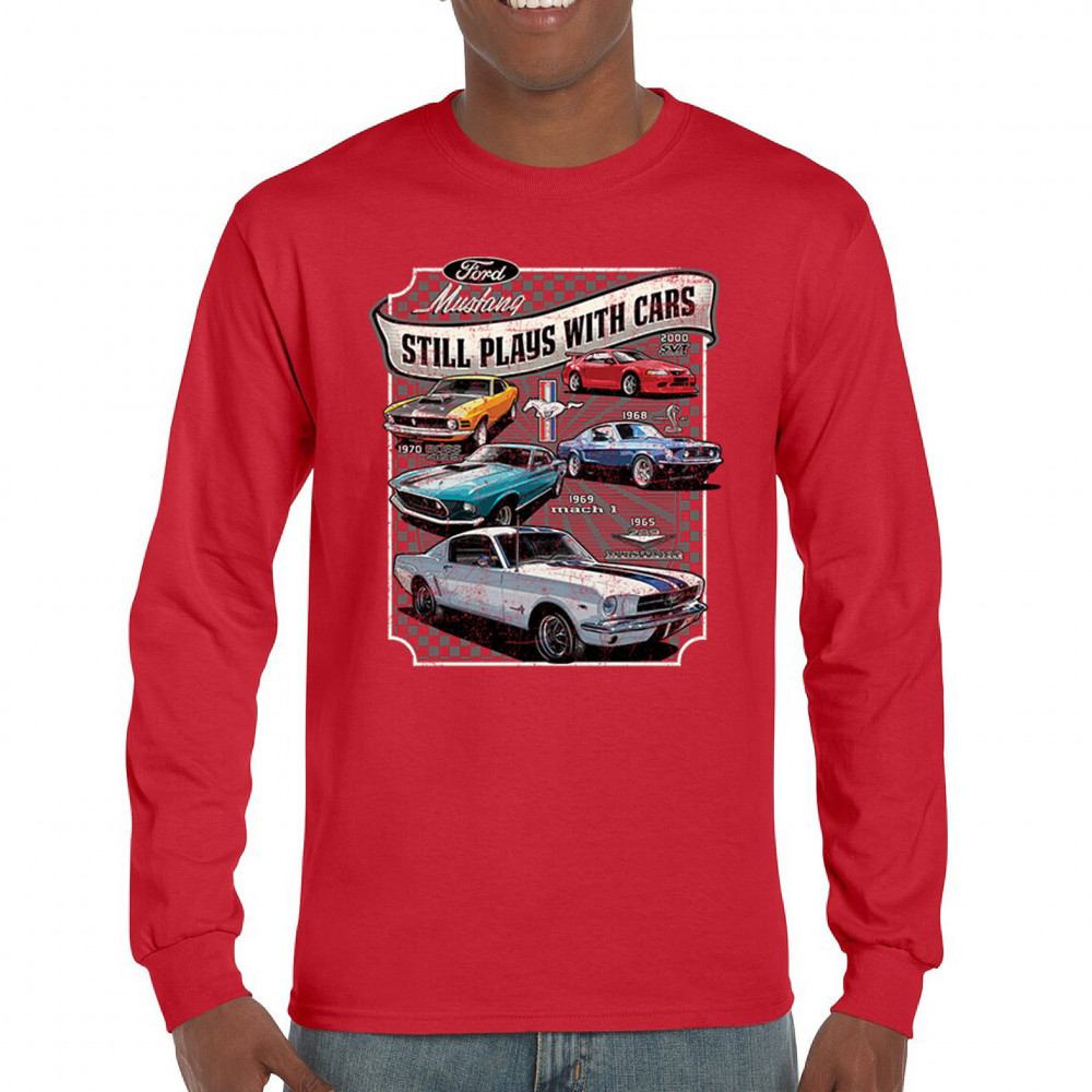 This bold Ford Mustang "Still Plays With Cars" design showcases six classic models from 1965 to 2000, including the 1969 Mach 1, 1970 Boss 302, and 2000 SVT. A dream graphic for muscle car lovers, collectors, and pony car fans. Great for classic auto shows, retro cruises, garage wear, or car clubs.