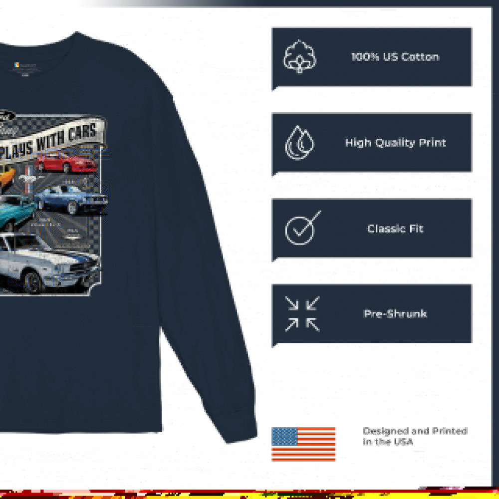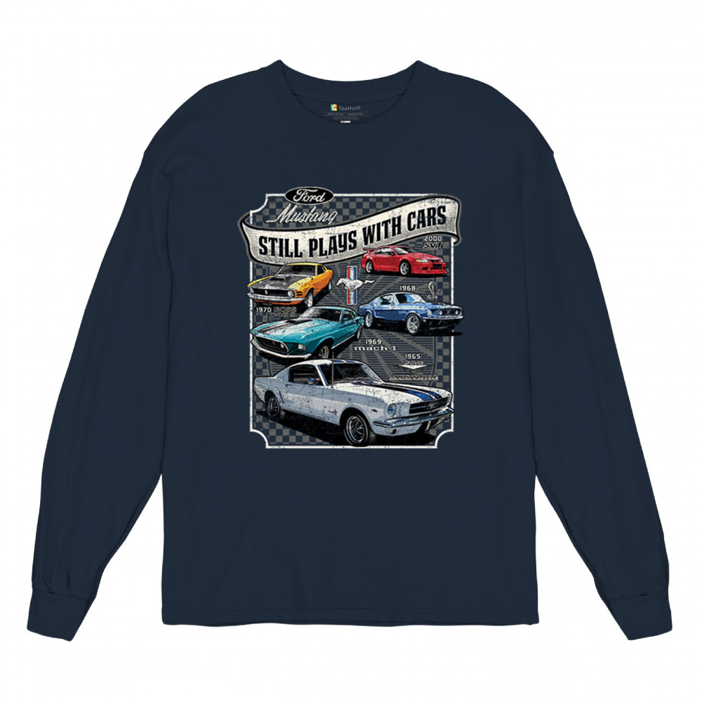 This bold Ford Mustang "Still Plays With Cars" design showcases six classic models from 1965 to 2000, including the 1969 Mach 1, 1970 Boss 302, and 2000 SVT. A dream graphic for muscle car lovers, collectors, and pony car fans. Great for classic auto shows, retro cruises, garage wear, or car clubs.