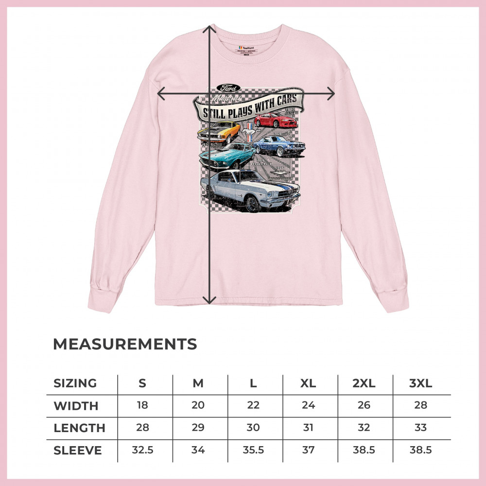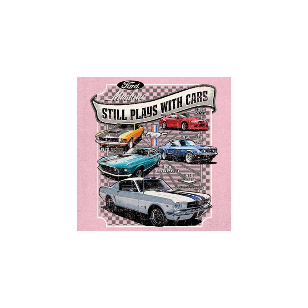 This bold Ford Mustang "Still Plays With Cars" design showcases six classic models from 1965 to 2000, including the 1969 Mach 1, 1970 Boss 302, and 2000 SVT. A dream graphic for muscle car lovers, collectors, and pony car fans. Great for classic auto shows, retro cruises, garage wear, or car clubs.