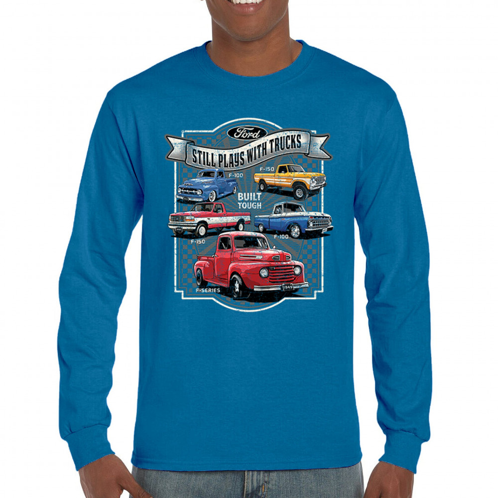 Features classic Ford F-Series trucks from 1949 to F-150. Great for vintage truck fans, garage wear, car shows, and collectors who love pickups.