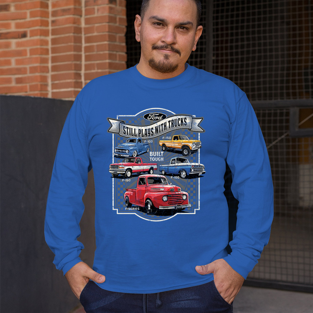 Celebrate decades of Ford pickup heritage with this bold design featuring classic F-Series trucks. From the original 1949 F-Series to vintage F-100 and F-150 models, it’s built for truck lovers, collectors, and weekend warriors. A perfect statement for shows, garages, or just showing your Ford pride.