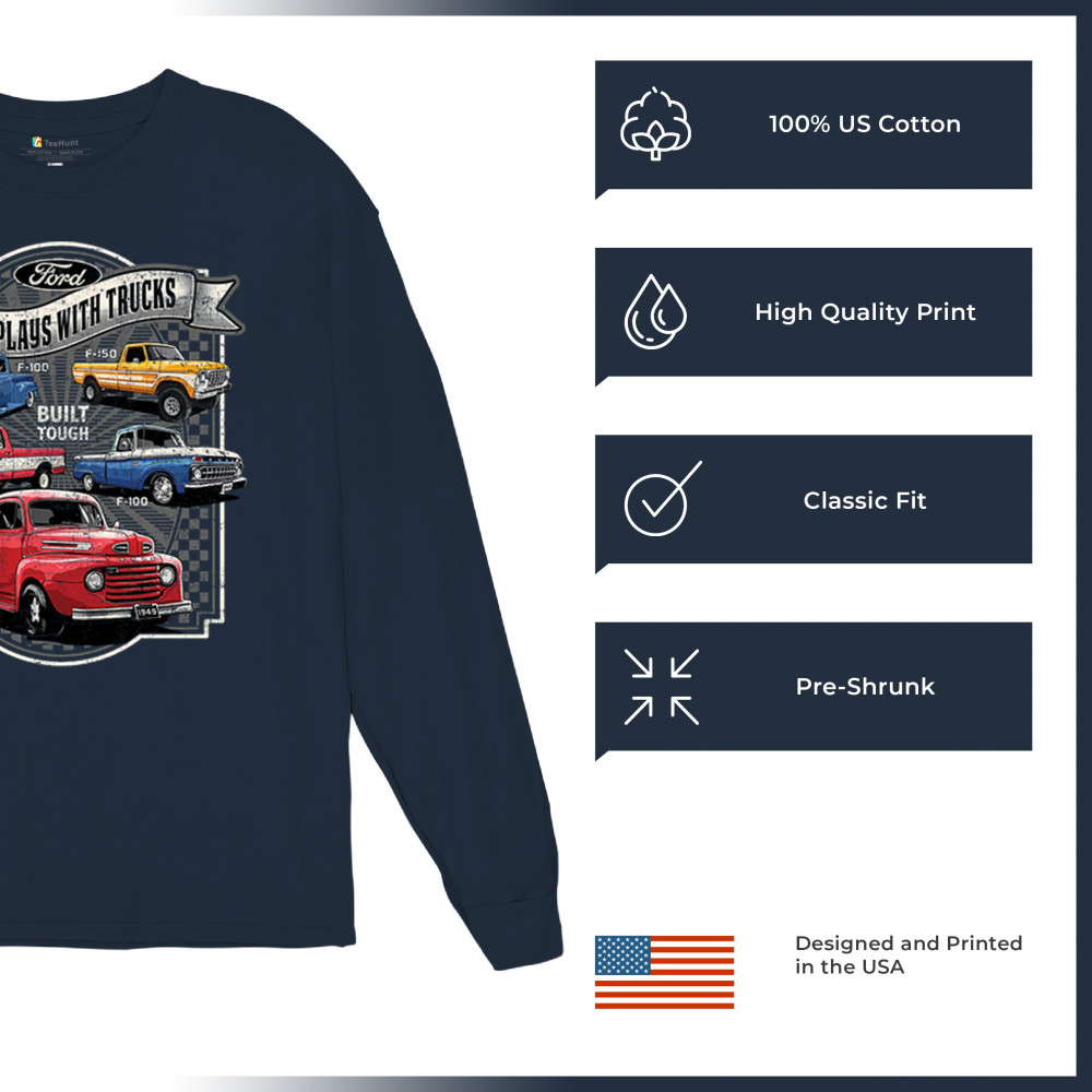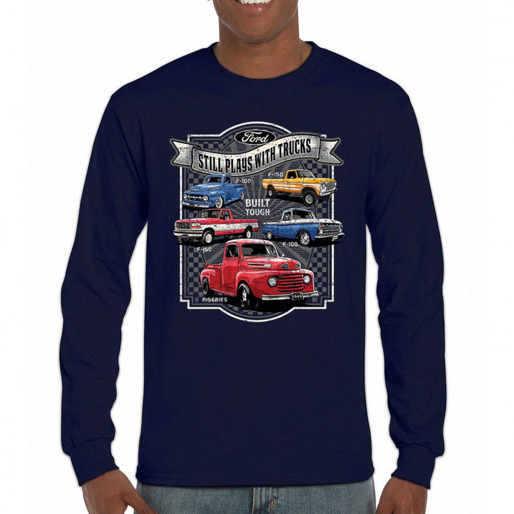Features classic Ford F-Series trucks from 1949 to F-150. Great for vintage truck fans, garage wear, car shows, and collectors who love pickups.